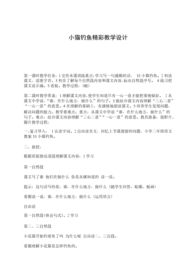 第一课时教学任务:l交待本课训练重点:学习写一句通顺的话,10小猫钓鱼。2初读课文,读准字音。3初步了解每个自然段内容和课文内容,标出自然段序号。4练习把课文读正确。5质疑。教学过程:(略)
