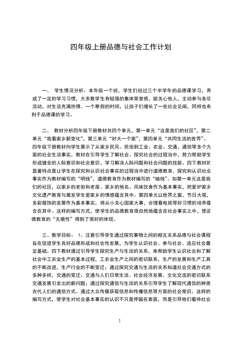 三、 教学目标:1。注意引导学生通过探究事物之间的相互关系品德与社会课程旨在促进学生良好品德形成和社会性发展,为学生认识社会、参与社会、适应社会奠定基础。四下教材通过引导学生探究生产与生活的关系,来帮助学生认识社会和了解社会中工农业生产的基本过程,工农业生产之间的密切联系,生产的发展和生产工具的不断改进,生产行业的不断变迁;通过探究交通与生活的关系知道社会交通方式的多种多样,交通的变迁、交通与人们日常生活、社会经济发展、文化交流的密切联系,交通发展引发出的新问题;通过探究通信与生活的关系引导学生了解现代通信的种类、古代人们的通信方式、通过大众传媒获取信息和传播信息等方面的社会常识。这样的编写方式,使学生对社会基本事实的认识不只是停留在表面,而是引导他们看待社会现象的时候,能探究和思考社会生活中,各类事物之间的相互关系及其本质。2。从学生熟悉的生活出发,引导学生对间接生活的认识和了解。儿童的品德和社会性源于他们对生活的认识、体验和感悟,儿童的现实生活对其品德的形成和社会性发展具有特殊的价值。因此四年级下册教材在编写时,注意了将社会事实方面的内容与儿童的生活联系起来,让他们能从自己的世界出发,用自己的眼睛观察社会,用自己的心灵感受社会,用自己的方式研究社会。