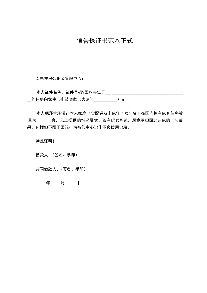 本人现郑重承诺:本人家庭(含配偶及未成年子女)名下在国内拥有成套住房数量为_______套,以上提供的情况属实。若有虚假陈述,愿意承担因此造成的一切后果,包括但不限于因该行为被您中心记作不良信用记录。