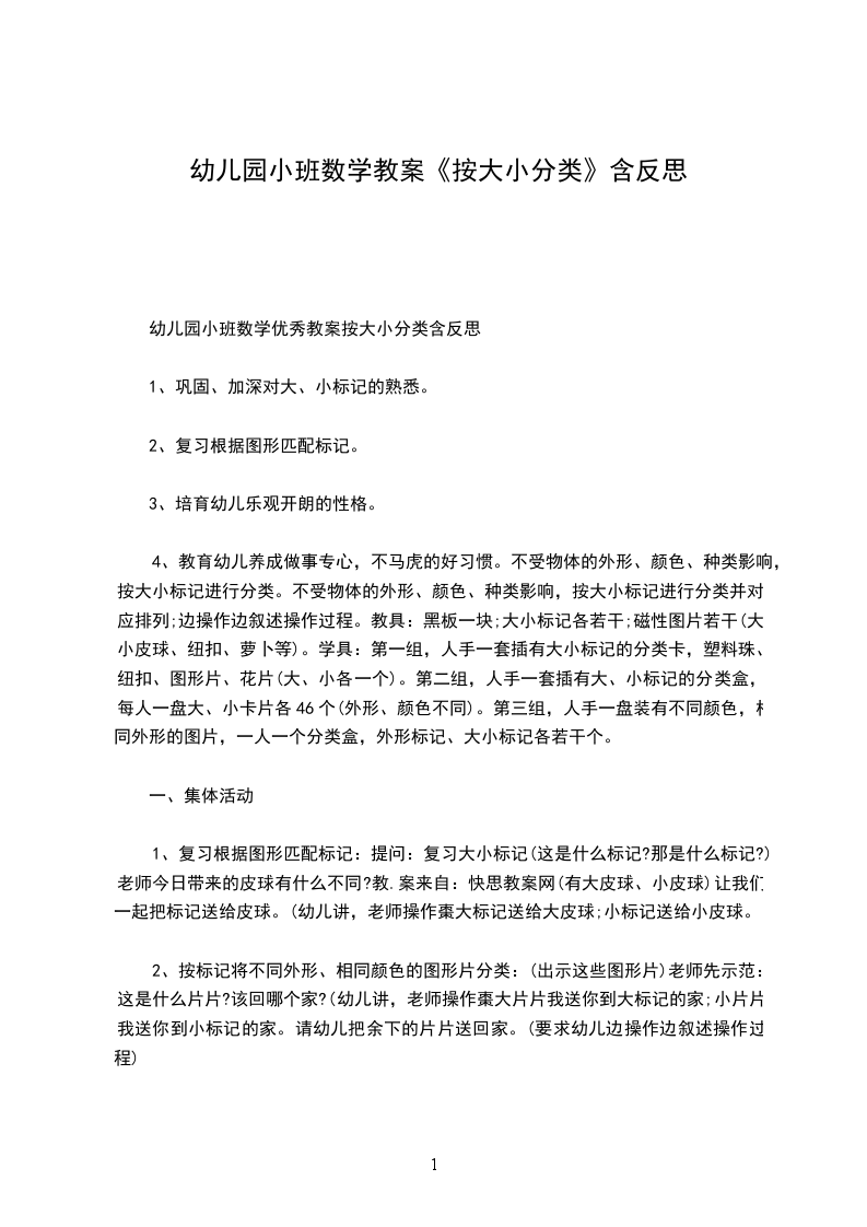 三、 活动评价1.请幼儿说一说自己操作的信封上的笑脸娃娃是几个,自己找了几张卡片,每张卡片上的物体有几个。2.师生共同带着购买的物品和笑脸信封到大班娃娃家去做客。教学反思:本次活动主要是针对孩子按数量的多少进行拿取物体,整个活动孩子都参与其中了,并且基本都能按老师的要求完成数量对应、按数取物,所以活动目标完成较好。小百科:数:是一个用作计数、标记或用作量度的抽象概念,是比较同质或同属性事物的等级的简单符号记录形式(或称度量)。代表数的一系列符号,包括数字、运算符号等统称为记数系统。在日常生活中,数通常出现在在标记(如公路、电话和门牌号码)、序列的指标(序列号)和代码(ISBN)上。在数学里,数的定义延伸至包含如分数、负数、无理数、超越数及复数等抽象化的概念。