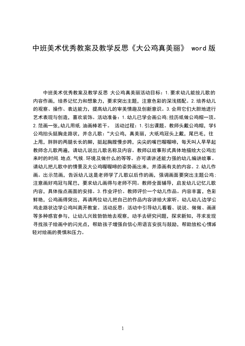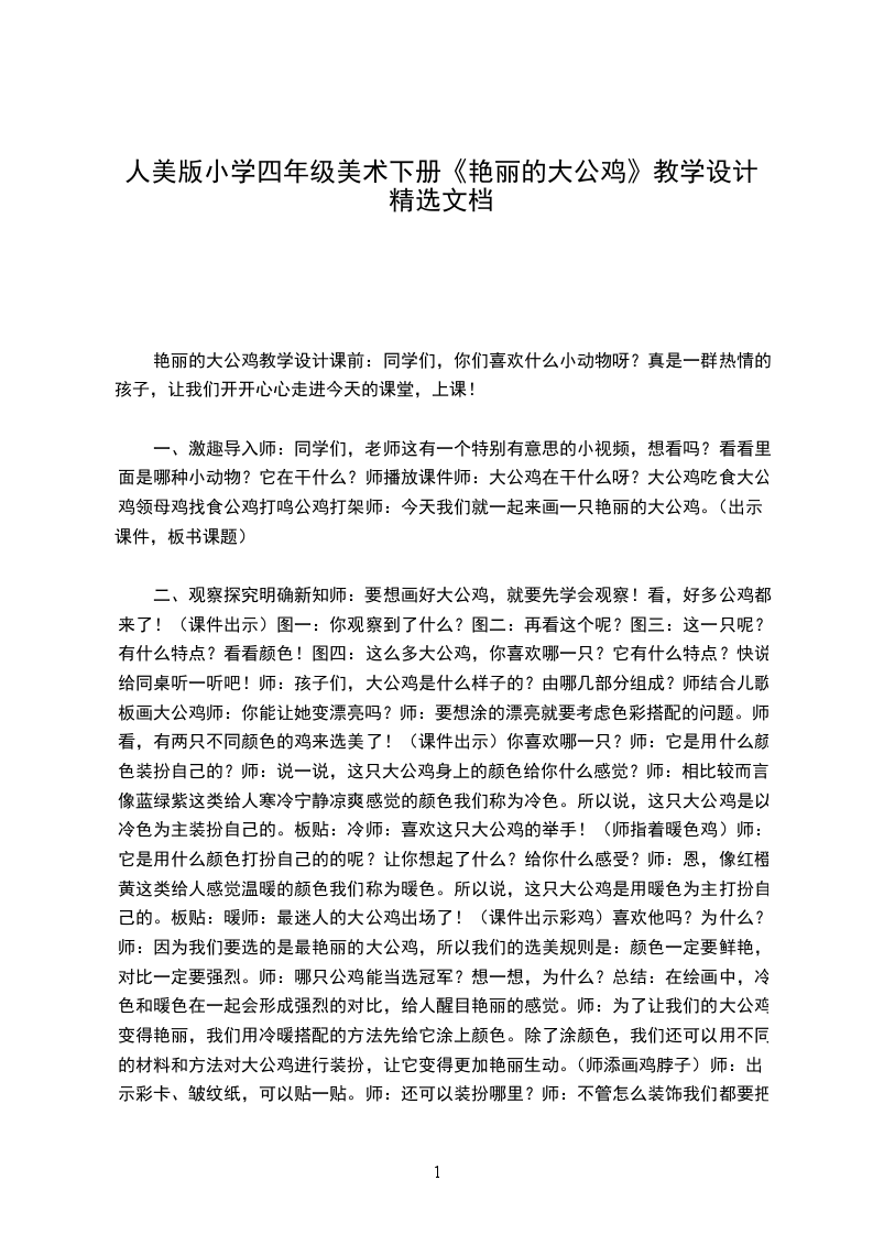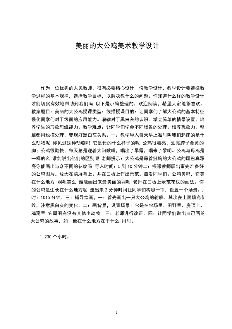 作为一位优秀的人民教师,很有必要精心设计一份教学设计,教学设计要遵循教学过程的基本规律,选择教学目标,以解决教什么的问题。你知道什么样的教学设计才能切实有效地帮助到我们吗 以下是小编整理的,欢迎阅读,希望大家能够喜欢。教案题目:美丽的大公鸡授课类型:线描授课目的:让同学们了解大公鸡的基本特征,强化同学们对于线面的应用能力。灌输对于黑白灰的认识。学会简单的情景设置。培养学生的形象思维能力。教学难点:让同学们学会不同场景的处理。培养想象力,整篇都用线描处理,变现好黑白灰关系。一:教学导入每天早上准时叫我们起床的是什么动物呢 你见过这种动物吗 它是长的什么样子的呢 公鸡很漂亮,油亮脖子金黄的脚;公鸡很勤快,每天总是迎着太阳歌唱,唱出了早霞,唱来了黎明。公鸡与母鸡是一样的么 谁能说出他们的区别呢 老师提示:大公鸡是昂首挺胸的大公鸡的尾巴真漂亮你能画出与众不同的花纹吗 导入时间:5到10分钟二:授课教师展出事先准备好的公鸡图片。放大在脑屏幕上。并在白板上作出示范。启发同学们:公鸡美吗,它美在什么地方 羽毛美么 谁能画出来最美丽的羽毛 老师在白板上示范花纹的画法。你的公鸡是生长在什么地方呢 流出来2分钟时间让同学们构思一下,设置一个场景。用时:1015分钟。三:辅导绘画,一:首先画出一只大公鸡的轮廓。其次在上面填充花纹,注意黑白灰的变化。二:画背景,设置场景;它是在农场里、田野里、房顶上、鸡窝里 它周围有没有其他小动物。三:老师进行改正。四:让同学们说出自己画的大公鸡的故事,如:他在什么地方在干什么 用时;