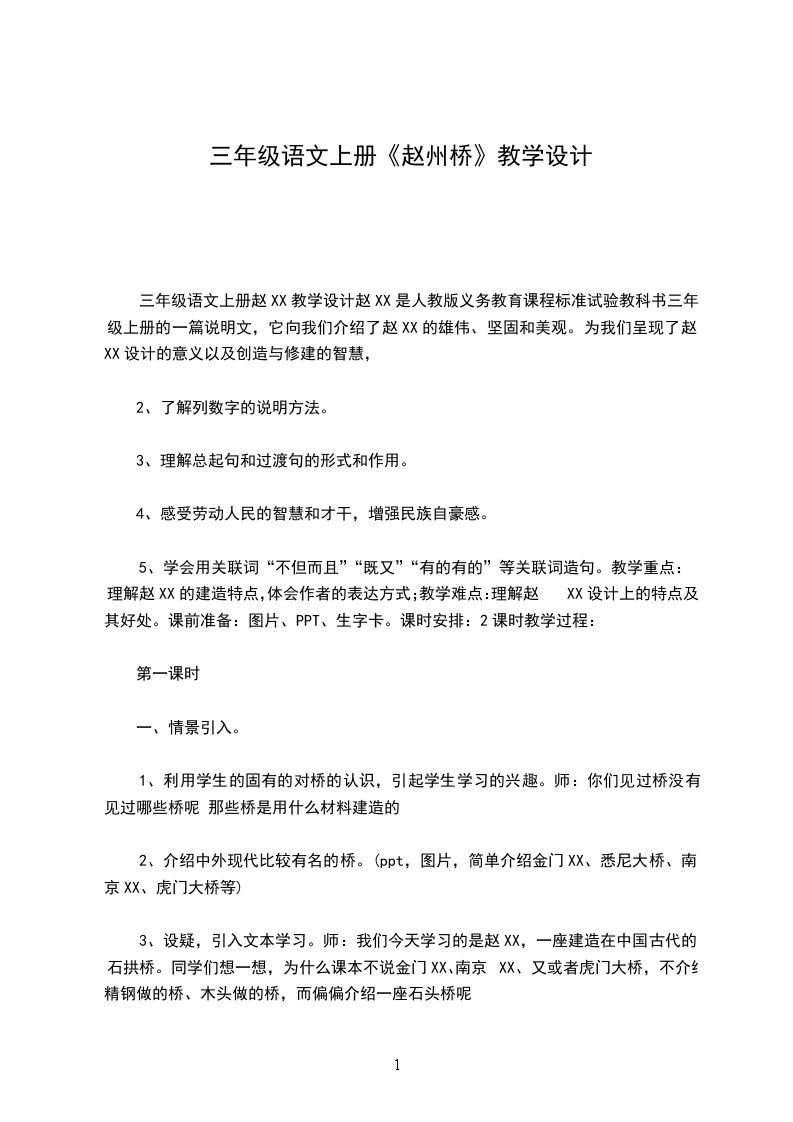 1、初读课文,了解课文大意。师:请同学们齐读课文,读完后,说说赵XX是一座什么样的桥 在课文中找出一句话,这句话告诉我们为什么课文不介绍其他桥而介绍赵XX。)(赵XX是一座世界闻名的桥)