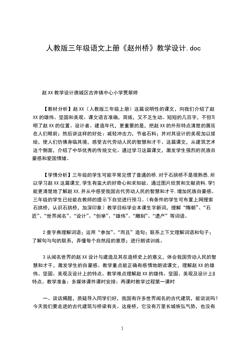 3、设疑,引入文本学习。师:我们今天学习的是赵XX,一座建造在中国古代的石拱桥。同学们想一想,为什么课本不说金门XX、南京XX、又或者虎门大桥,不介绍精钢做的桥、木头做的桥,而偏偏介绍一座石头桥呢