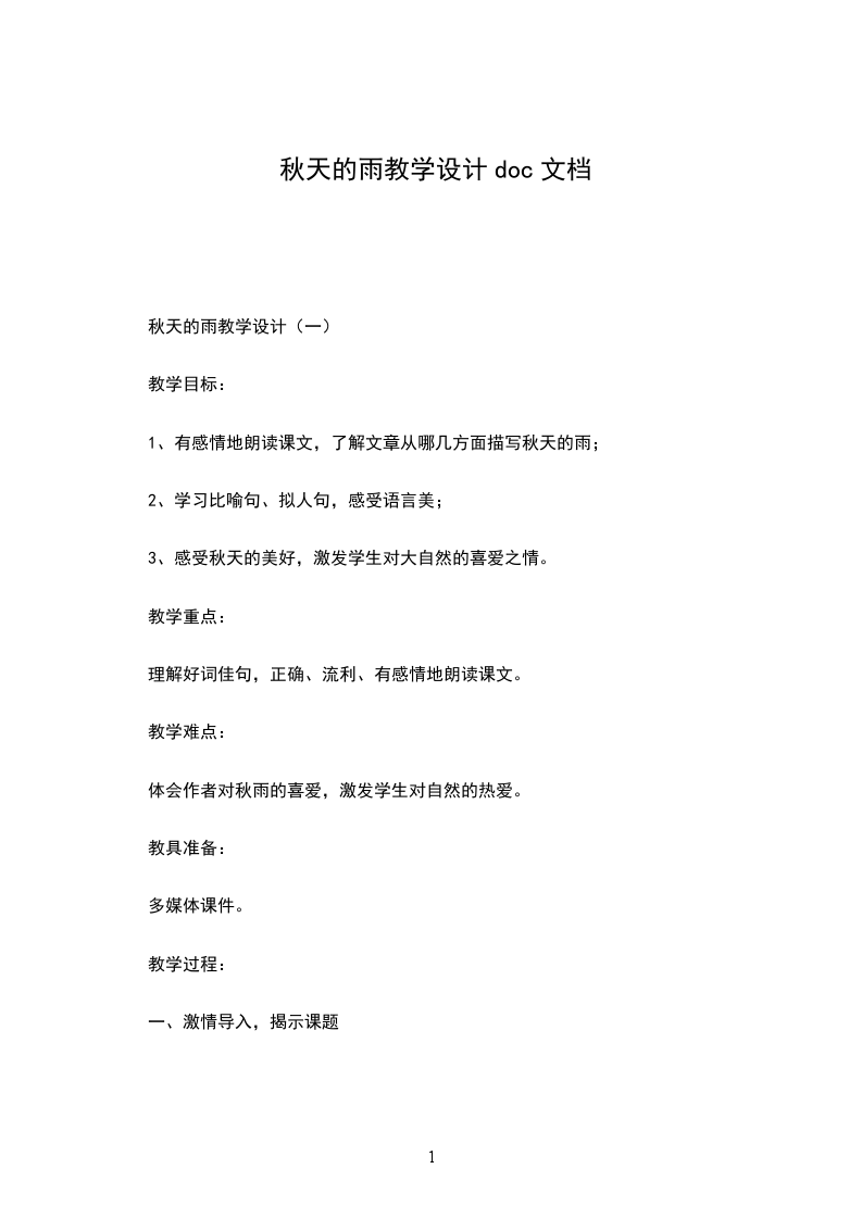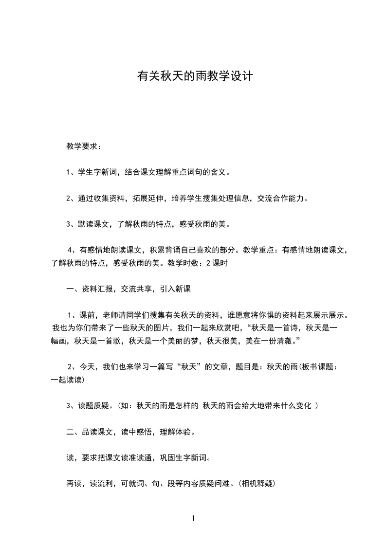 4、有感情地朗读课文,积累背诵自己喜欢的部分。教学重点:有感情地朗读课文,了解秋雨的特点,感受秋雨的美。教学时数:2课时