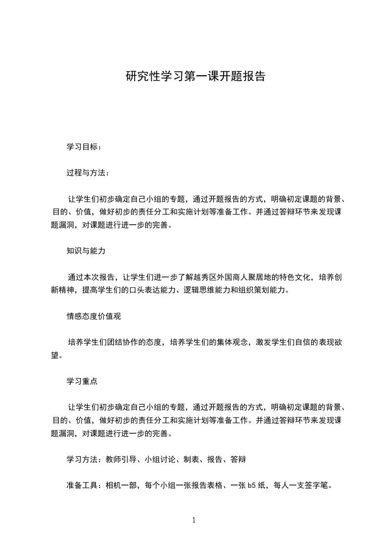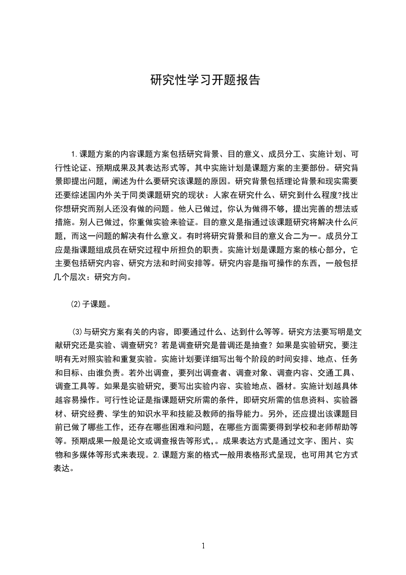 (3)与研究方案有关的内容,即要通过什么、达到什么等等。研究方法要写明是文献研究还是实验、调查研究?若是调查研究是普调还是抽查?如果是实验研究,要注明有无对照实验和重复实验。实施计划要详细写出每个阶段的时间安排、地点、任务和目标、由谁负责。若外出调查,要列出调查者、调查对象、调查内容、交通工具、调查工具等。如果是实验研究,要写出实验内容、实验地点、器材。实施计划越具体,越容易操作。可行性论证是指课题研究所需的条件,即研究所需的信息资料、实验器材、研究经费、学生的知识水平和技能及教师的指导能力。另外,还应提出该课题目前已做了哪些工作,还存在哪些困难和问题,在哪些方面需要得到学校和老师帮助等等。预期成果一般是论文或调查报告等形式,。成果表达方式是通过文字、图片、实物和多媒体等形式来表现。2.课题方案的格式一般用表格形式呈现,也可用其它方式表达。