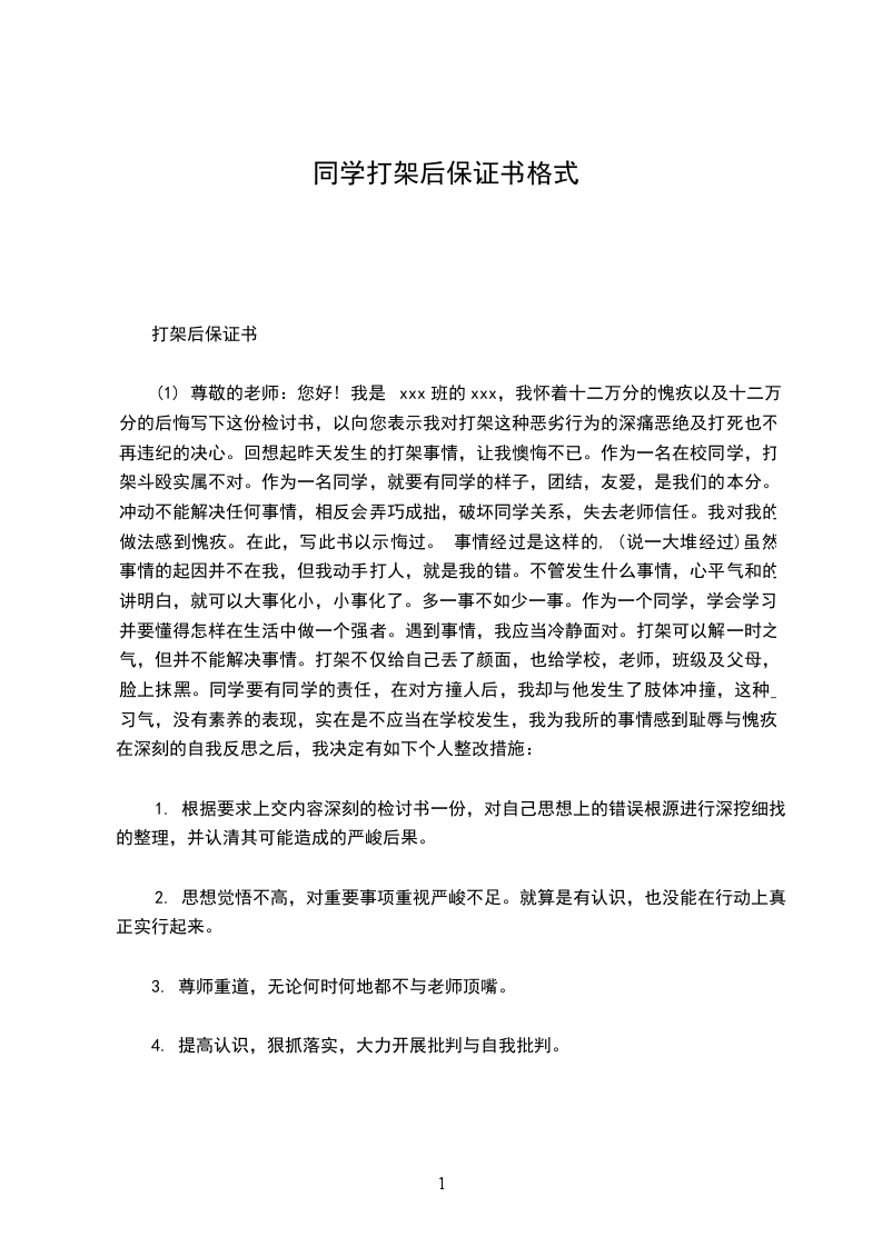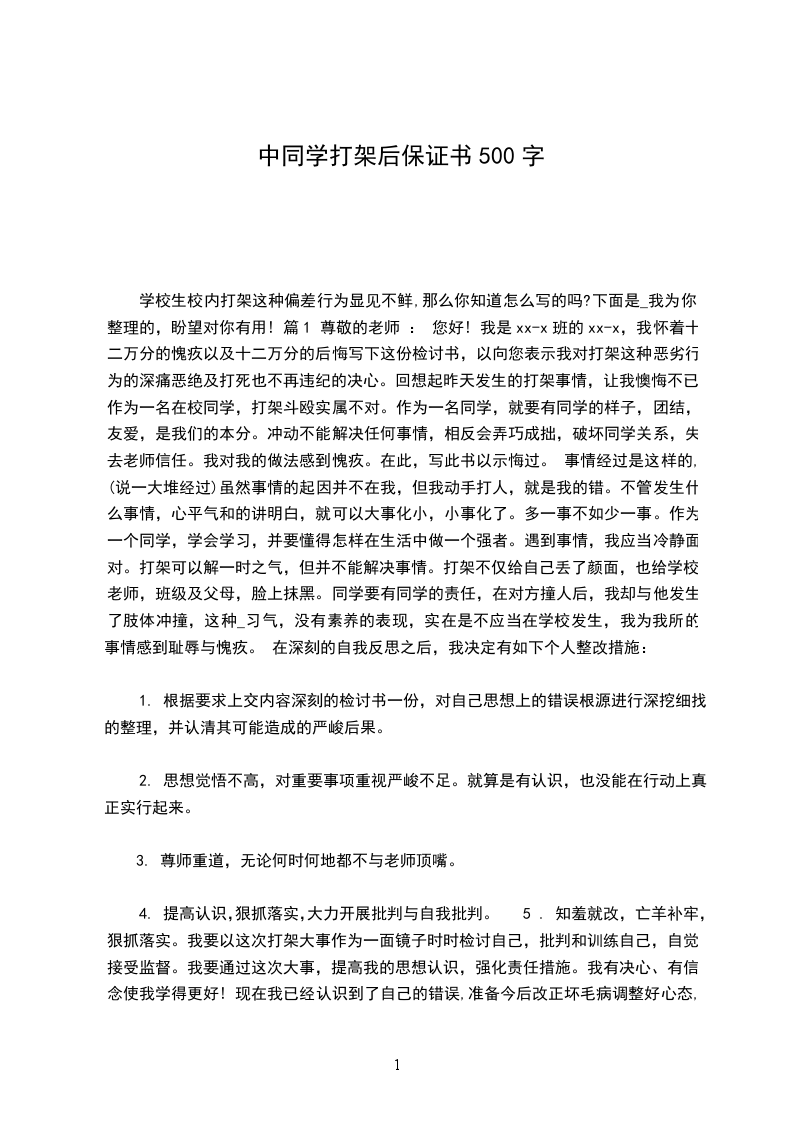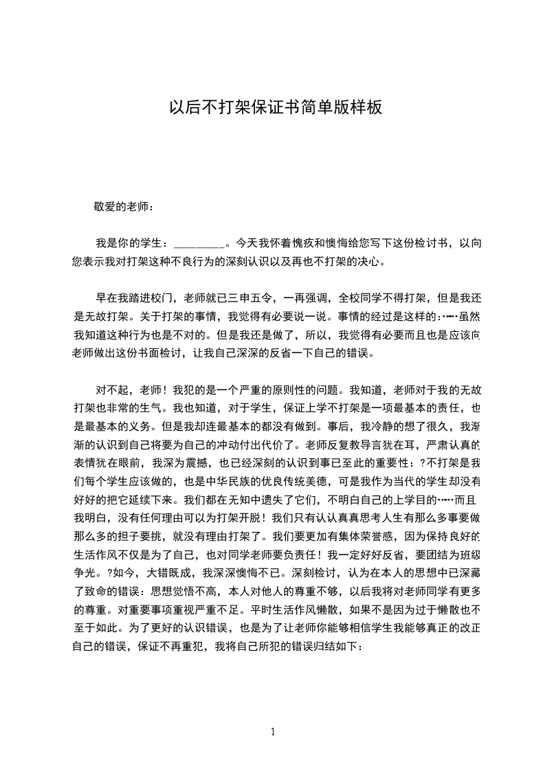 我是你的学生:_________。今天我怀着愧疚和懊悔给您写下这份检讨书,以向您表示我对打架这种不良行为的深刻认识以及再也不打架的决心。