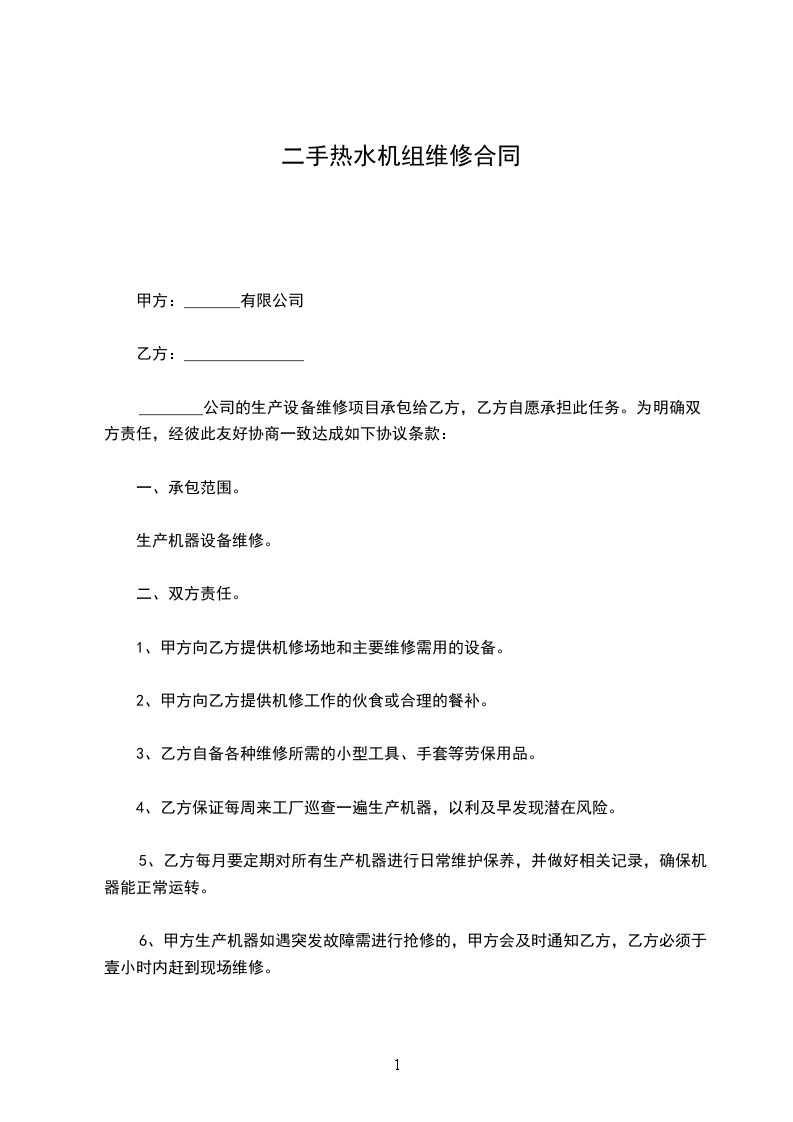 ________公司的生产设备维修项目承包给乙方,乙方自愿承担此任务。为明确双方责任,经彼此友好协商一致达成如下协议条款: