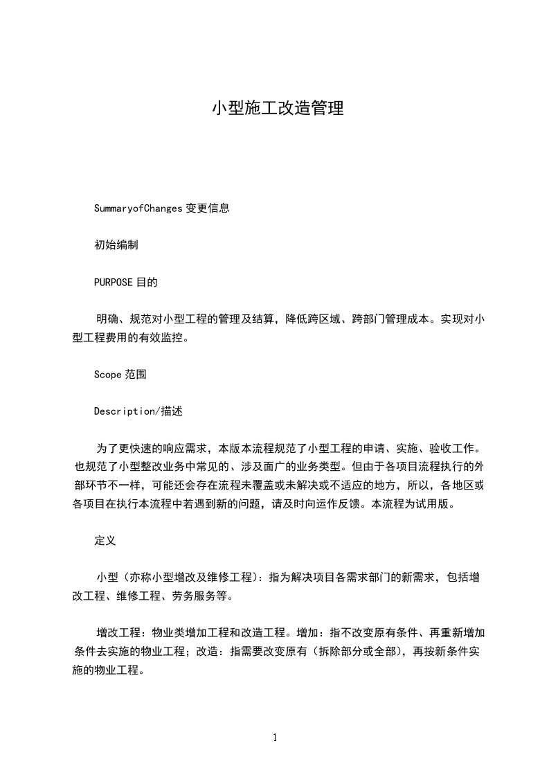 为了更快速的响应需求,本版本流程规范了小型工程的申请、实施、验收工作。也规范了小型整改业务中常见的、涉及面广的业务类型。但由于各项目流程执行的外部环节不一样,可能还会存在流程未覆盖或未解决或不适应的地方,所以,各地区或各项目在执行本流程中若遇到新的问题,请及时向运作反馈。本流程为试用版。