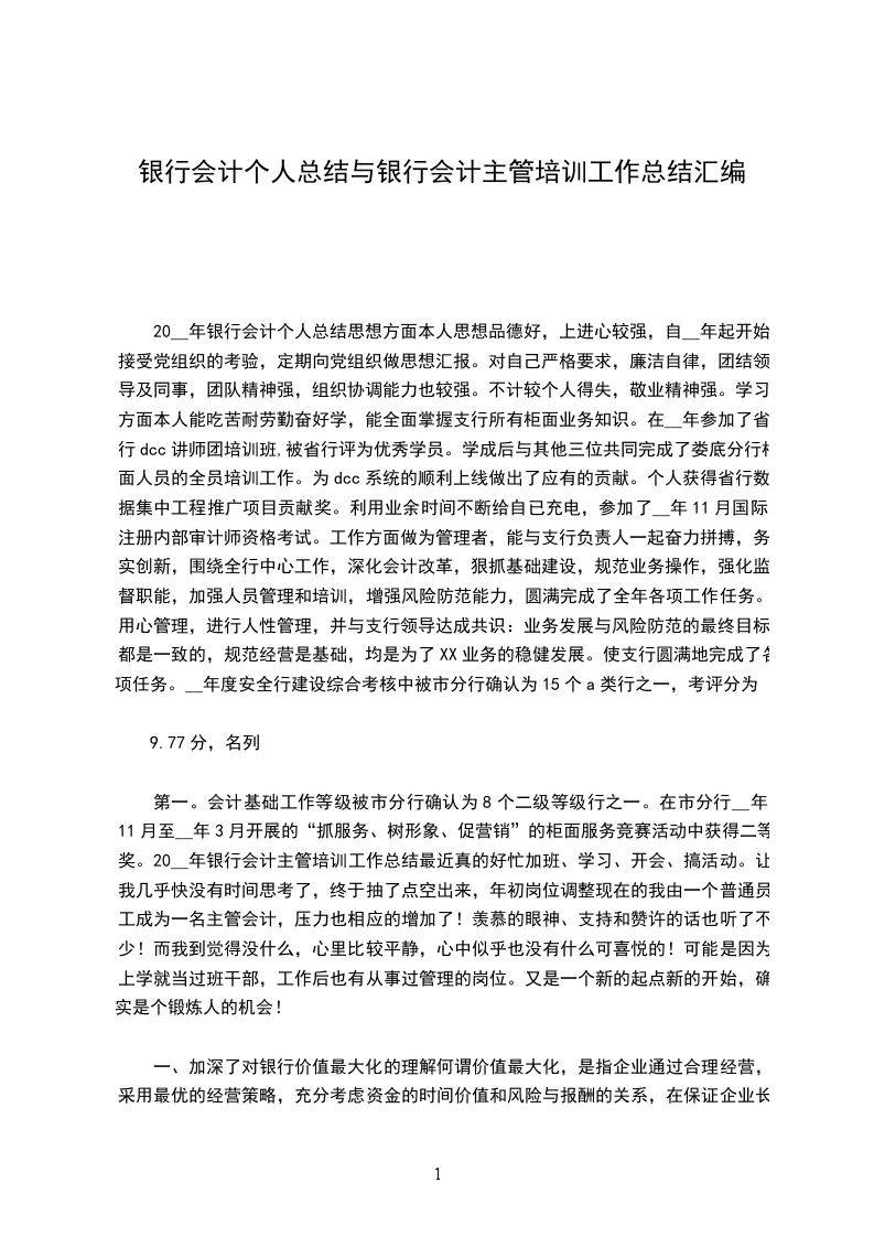 第一。会计基础工作等级被市分行确认为8个二级等级行之一。在市分行__年11月至__年3月开展的“抓服务、树形象、促营销”的柜面服务竞赛活动中获得二等奖。20__年银行会计主管培训工作总结最近真的好忙加班、学习、开会、搞活动。让我几乎快没有时间思考了,终于抽了点空出来,年初岗位调整现在的我由一个普通员工成为一名主管会计,压力也相应的增加了!羡慕的眼神、支持和赞许的话也听了不少!而我到觉得没什么,心里比较平静,心中似乎也没有什么可喜悦的!可能是因为上学就当过班干部,工作后也有从事过管理的岗位。又是一个新的起点新的开始,确实是个锻炼人的机会!