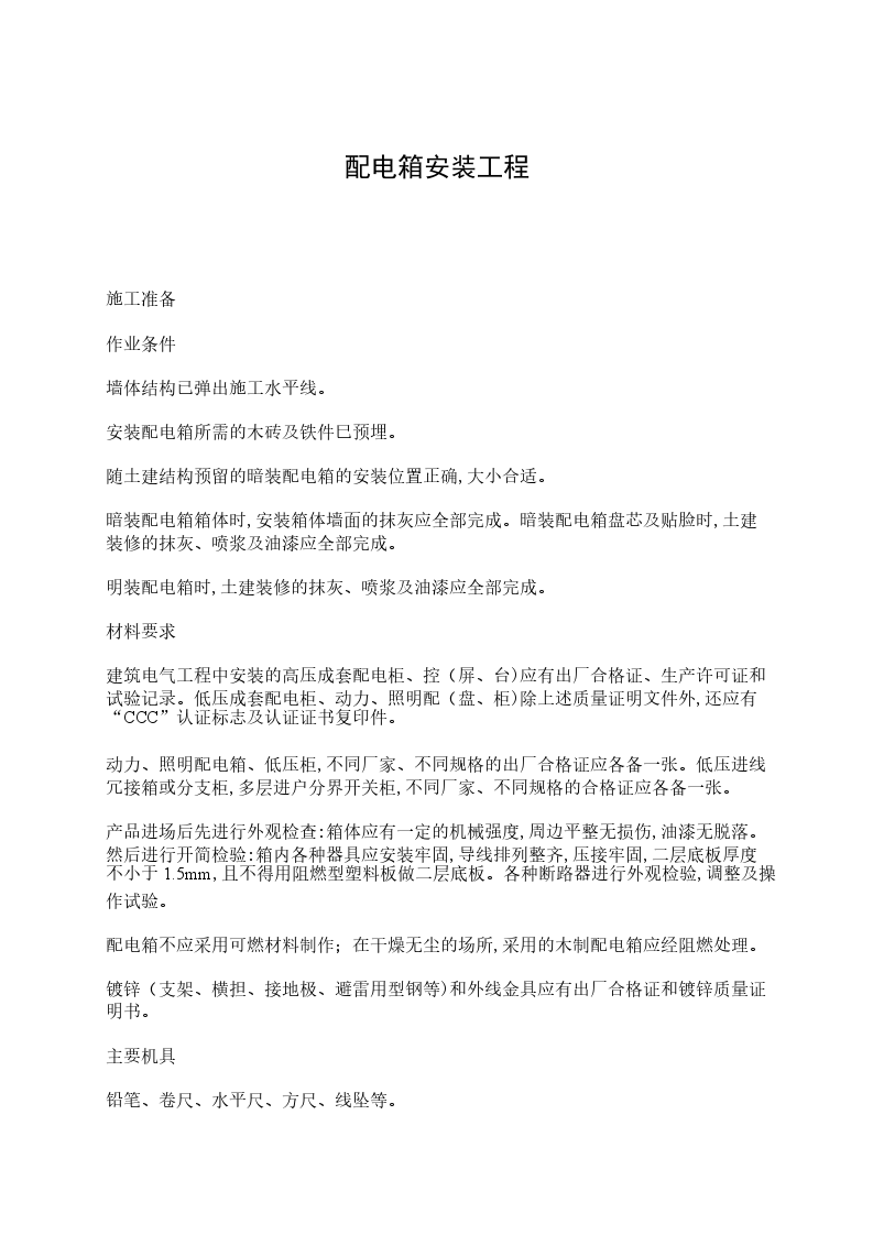 5、明装配电箱时,土建装修的抹灰、喷浆及油漆应全部完成。(二)材料要求