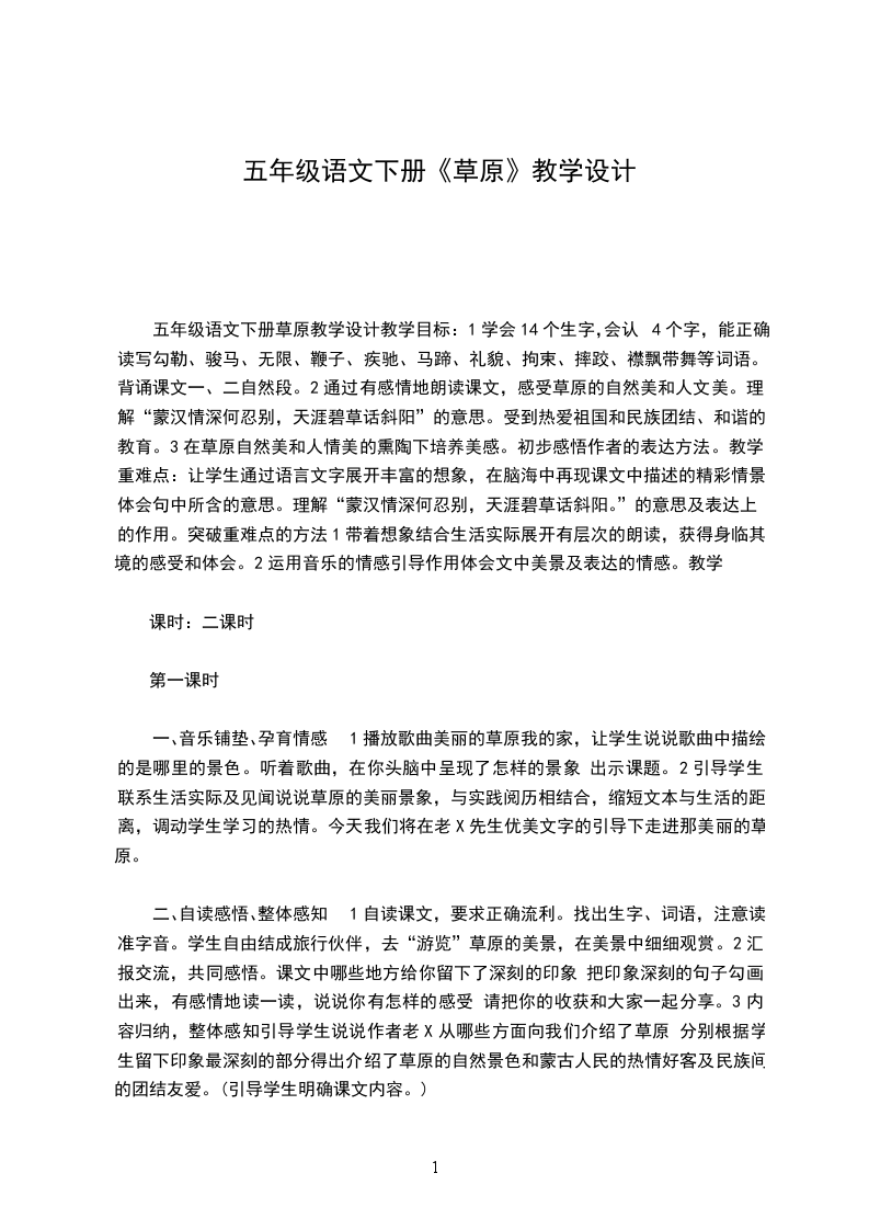 五年级语文下册草原教学设计教学目标:1学会14个生字,会认4个字,能正确读写勾勒、骏马、无限、鞭子、疾驰、马蹄、礼貌、拘束、摔跤、襟飘带舞等词语。背诵课文一、二自然段。2通过有感情地朗读课文,感受草原的自然美和人文美。理解“蒙汉情深何忍别,天涯碧草话斜阳”的意思。受到热爱祖国和民族团结、和谐的教育。3在草原自然美和人情美的熏陶下培养美感。初步感悟作者的表达方法。教学重难点:让学生通过语言文字展开丰富的想象,在脑海中再现课文中描述的精彩情景,体会句中所含的意思。理解“蒙汉情深何忍别,天涯碧草话斜阳。”的意思及表达上的作用。突破重难点的方法1带着想象结合生活实际展开有层次的朗读,获得身临其境的感受和体会。2运用音乐的情感引导作用体会文中美景及表达的情感。教学