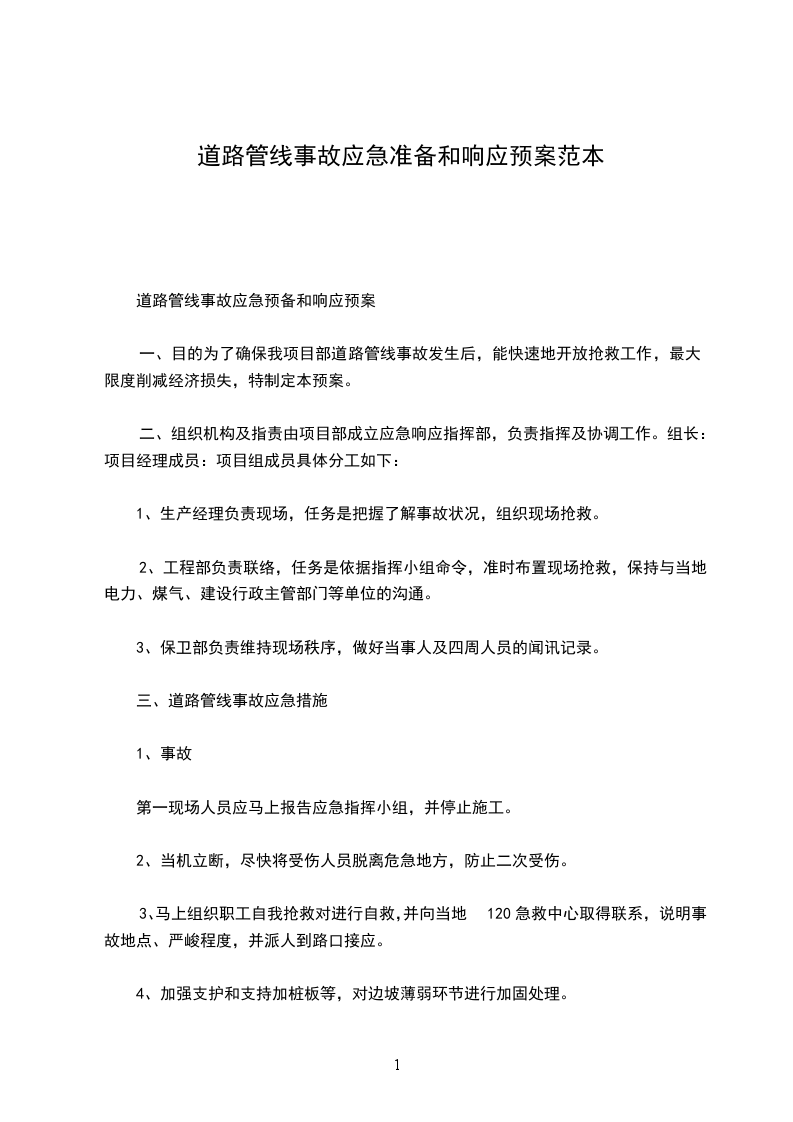 一、目的为了确保我项目部道路管线事故发生后,能快速地开放抢救工作,最大限度削减经济损失,特制定本预案。