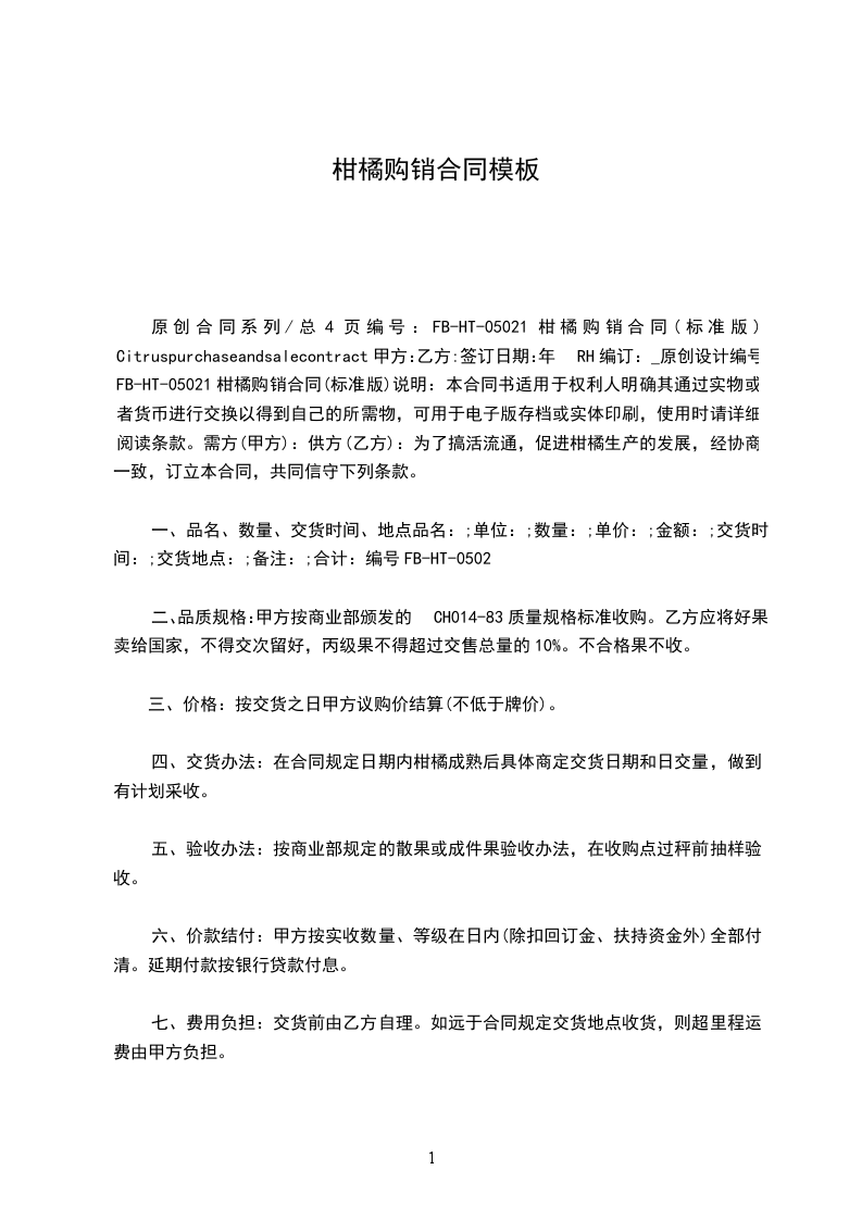 原创合同系列/总4页编号:FB-HT-05021柑橘购销合同(标准版)Citruspurchaseandsalecontract甲方:乙方:签订日期:年RH编订:_原创设计编号FB-HT-05021柑橘购销合同(标准版)说明:本合同书适用于权利人明确其通过实物或者货币进行交换以得到自己的所需物,可用于电子版存档或实体印刷,使用时请详细阅读条款。需方(甲方):供方(乙方):为了搞活流通,促进柑橘生产的发展,经协商一致,订立本合同,共同信守下列条款。