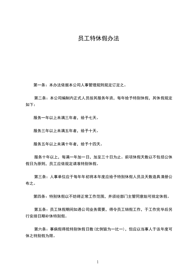 第五条:员工休假期间如遇公司业务需要,得令员工销假工作,于工作完毕后另行安排日期补休特别假。