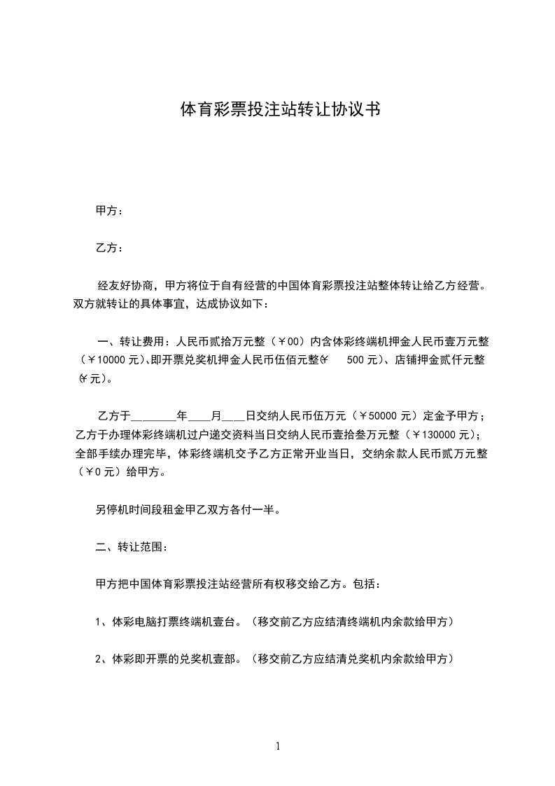 甲方把中国体育彩票投注站经营所有权移交给乙方。包括: