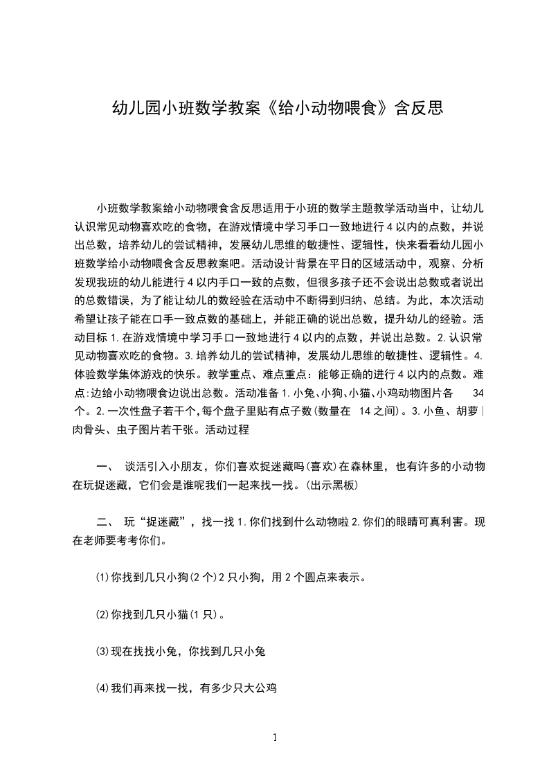 小班数学教案给小动物喂食含反思适用于小班的数学主题教学活动当中,让幼儿认识常见动物喜欢吃的食物,在游戏情境中学习手口一致地进行4以内的点数,并说出总数,培养幼儿的尝试精神,发展幼儿思维的敏捷性、逻辑性,快来看看幼儿园小班数学给小动物喂食含反思教案吧。活动设计背景在平日的区域活动中,观察、分析发现我班的幼儿能进行4以内手口一致的点数,但很多孩子还不会说出总数或者说出的总数错误,为了能让幼儿的数经验在活动中不断得到归纳、总结。为此,本次活动希望让孩子能在口手一致点数的基础上,并能正确的说出总数,提升幼儿的经验。活动目标1.在游戏情境中学习手口一致地进行4以内的点数,并说出总数。2.认识常见动物喜欢吃的食物。3.培养幼儿的尝试精神,发展幼儿思维的敏捷性、逻辑性。4.体验数学集体游戏的快乐。教学重点、难点重点:能够正确的进行4以内的点数。难点:边给小动物喂食边说出总数。活动准备1.小兔、小狗、小猫、小鸡动物图片各34个。2.一次性盘子若干个,每个盘子里贴有点子数(数量在14之间)。3.小鱼、胡萝卜、肉骨头、虫子图片若干张。活动过程