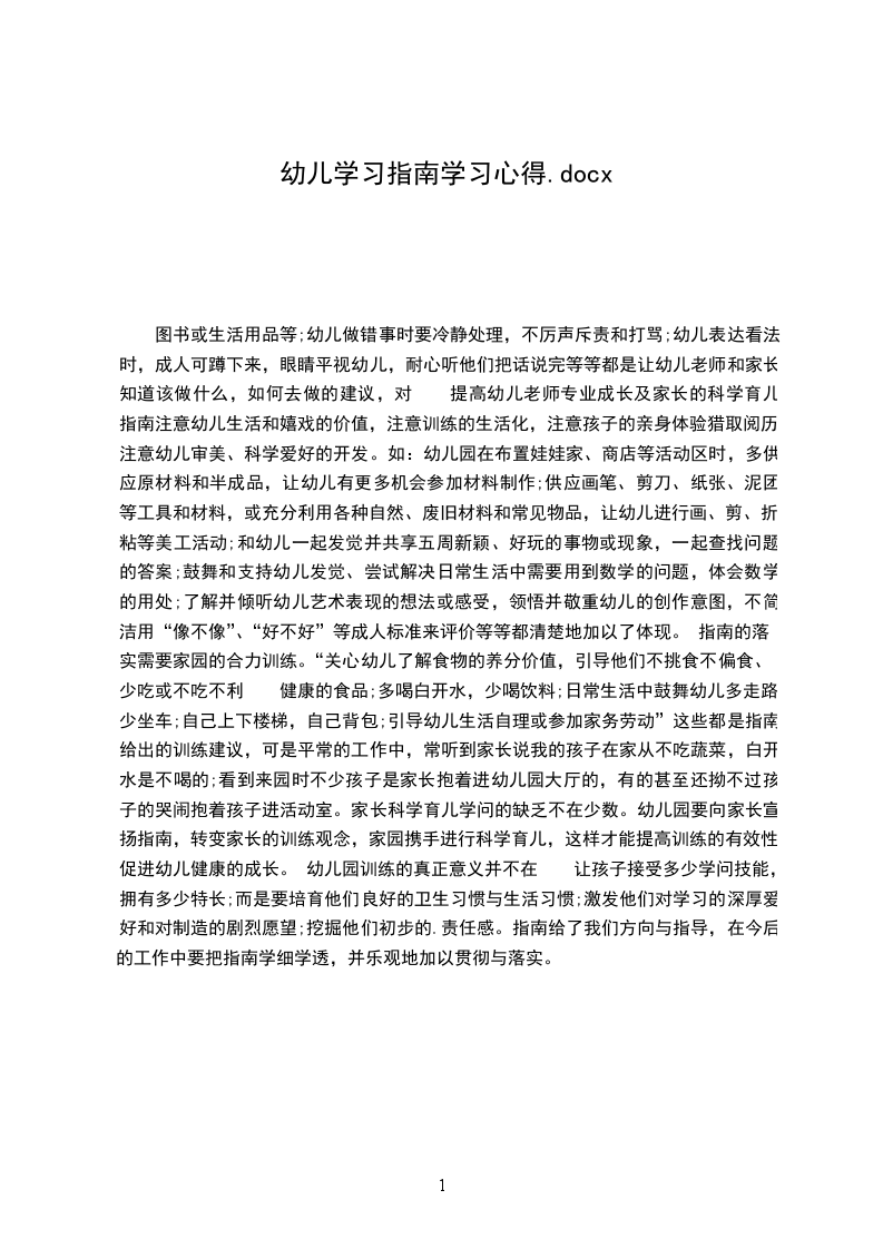 图书或生活用品等;幼儿做错事时要冷静处理,不厉声斥责和打骂;幼儿表达看法时,成人可蹲下来,眼睛平视幼儿,耐心听他们把话说完等等都是让幼儿老师和家长知道该做什么,如何去做的建议,对 提高幼儿老师专业成长及家长的科学育儿 指南注意幼儿生活和嬉戏的价值,注意训练的生活化,注意孩子的亲身体验猎取阅历,注意幼儿审美、科学爱好的开发。如:幼儿园在布置娃娃家、商店等活动区时,多供应原材料和半成品,让幼儿有更多机会参加材料制作;供应画笔、剪刀、纸张、泥团等工具和材料,或充分利用各种自然、废旧材料和常见物品,让幼儿进行画、剪、折、粘等美工活动;和幼儿一起发觉并共享五周新颖、好玩的事物或现象,一起查找问题的答案;鼓舞和支持幼儿发觉、尝试解决日常生活中需要用到数学的问题,体会数学的用处;了解并倾听幼儿艺术表现的想法或感受,领悟并敬重幼儿的创作意图,不简洁用“像不像”、“好不好”等成人标准来评价等等都清楚地加以了体现。 指南的落实需要家园的合力训练。“关心幼儿了解食物的养分价值,引导他们不挑食不偏食、少吃或不吃不利 健康的食品;多喝白开水,少喝饮料;日常生活中鼓舞幼儿多走路、少坐车;自己上下楼梯,自己背包;引导幼儿生活自理或参加家务劳动”这些都是指南给出的训练建议,可是平常的工作中,常听到家长说我的孩子在家从不吃蔬菜,白开水是不喝的;看到来园时不少孩子是家长抱着进幼儿园大厅的,有的甚至还拗不过孩子的哭闹抱着孩子进活动室。家长科学育儿学问的缺乏不在少数。幼儿园要向家长宣扬指南,转变家长的训练观念,家园携手进行科学育儿,这样才能提高训练的有效性,促进幼儿健康的成长。 幼儿园训练的真正意义并不在 让孩子接受多少学问技能,拥有多少特长;而是要培育他们良好的卫生习惯与生活习惯;激发他们对学习的深厚爱好和对制造的剧烈愿望;挖掘他们初步的.责任感。指南给了我们方向与指导,在今后的工作中要把指南学细学透,并乐观地加以贯彻与落实。