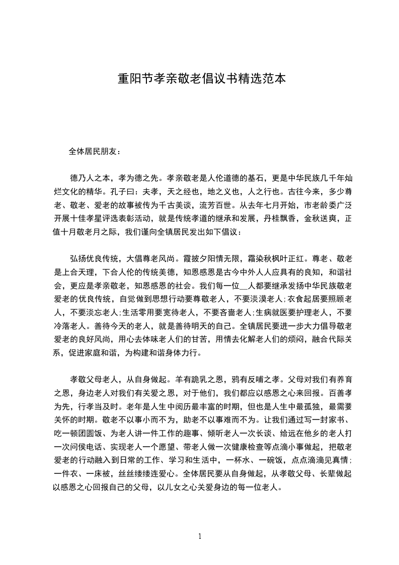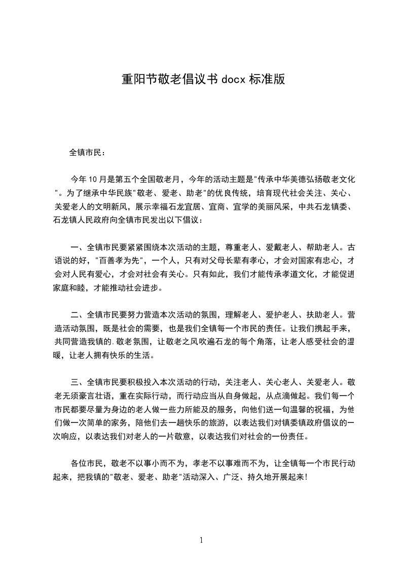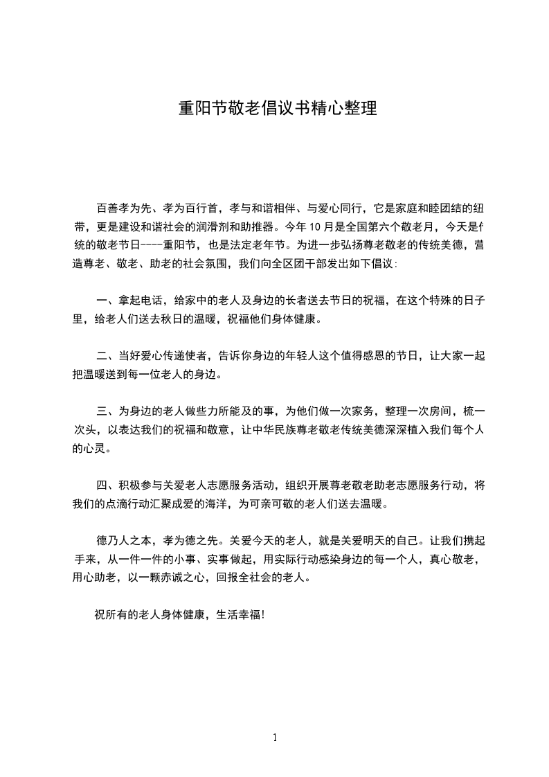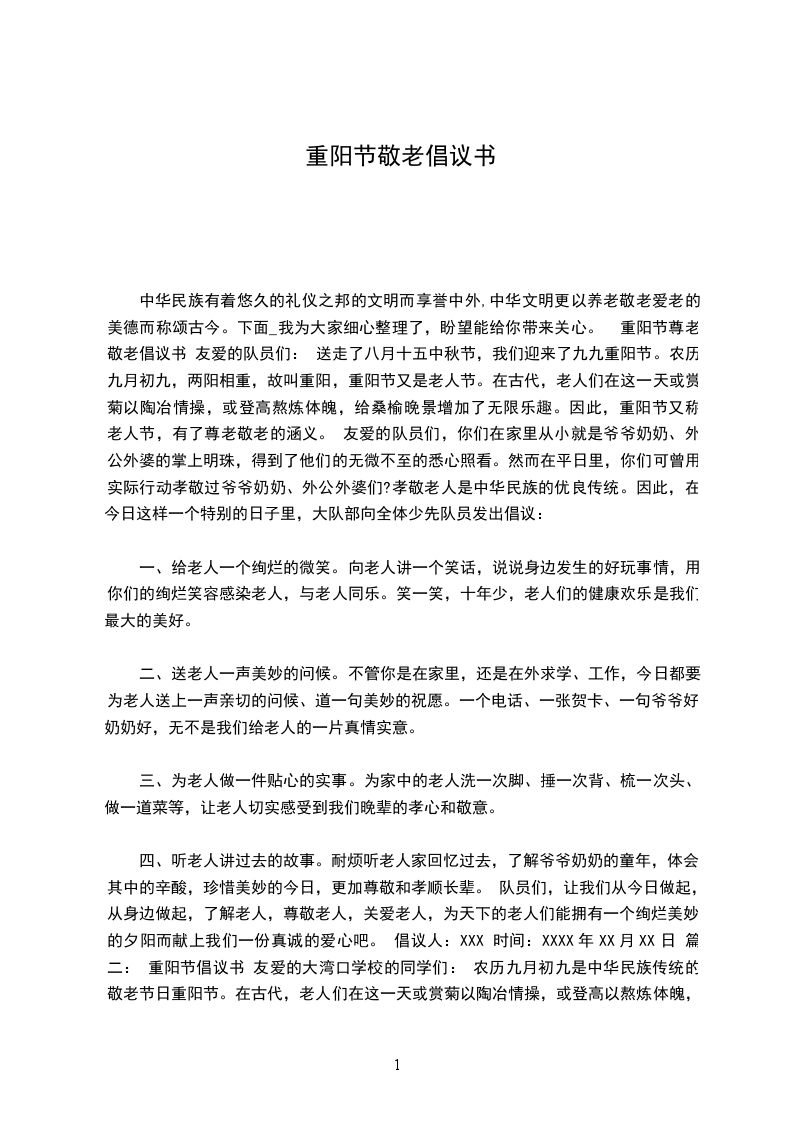 四、听老人讲过去的故事。耐烦听老人家回忆过去,了解爷爷奶奶的童年,体会其中的辛酸,珍惜美妙的今日,更加尊敬和孝顺长辈。 队员们,让我们从今日做起,从身边做起,了解老人,尊敬老人,关爱老人,为天下的老人们能拥有一个绚烂美妙的夕阳而献上我们一份真诚的爱心吧。 倡议人:XXX 时间:XXXX年XX月XX日 篇二: 重阳节倡议书 友爱的大湾口学校的同学们: 农历九月初九是中华民族传统的敬老节日重阳节。在古代,老人们在这一天或赏菊以陶冶情操,或登高以熬炼体魄,给桑榆晚景增加了无限乐趣,因此重阳节又称老人节,有了尊老敬老的涵义。 尊老敬老始终是中华民族的传统美德,德乃人之本,孝为德之先。同学们从生下来,就是老人们心中的 小公主、小太阳,得到老人们的悉心照看。然而我们可曾孝敬过为我们付出关爱与辛劳的爷爷、奶奶、外公、外婆、爸爸、妈妈?他们照看我们、牵挂我们,想一想我能为他们做了些什么呢?在其次十四个老人节来临之际,为弘扬中华民族尊老爱老敬老的传统美德,激发同学们的敬老、爱老意识和情感,塑造同学们敬重老人、关怀老人的良好品质和文明素养。日常生活中,能以实际行动去关怀老人、尊敬老人、主动为老人做事,大湾口学校二班级全体班同学将开展九九重阳节,浓浓敬老情。我是文明学校生,孝老敬亲从我做起为主题的活动,同时,我们也向大湾口学校的同学们发出倡议: