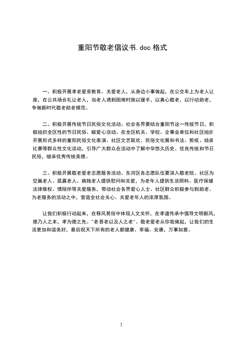 (2)我想对爷爷奶奶说句心里话。 九九重阳节 敬老看我行。重阳节快到了,不管做什么,只要我们用心去做,信任长辈们会眉飞色舞他们的健康、欢乐是我们最大的美好。让我们主动行动起来,用我们的实际行动将爱回报给他们。让我们主动行动起来,投身到这场孝敬活动中去吧,信任今年你们班级体中的 敬老之星就是你! 倡议人:XXX 时间:XXXX年XX月XX日 篇三: 重阳节敬老爱老倡议书 重阳节形成 战国时期,在唐代被定为正式的节日,此后历朝历代沿袭至今。古人在重阳节这天,往往会结伴出游、登高远眺、赏菊赋诗、采插茱萸,还有传统的美食重阳糕、醉人的菊花酒为伴,让人俯仰天地,游目骋怀。建国后,人民政府把重阳节定为老人节,提倡全_树立尊老、敬老、爱老、助老的风气。1989年,我国把每年的农历九月九日定为老人节,成为爱老、助老的节日。 德乃人之本,孝为德之先。尊老、敬老作为中华民族几千绚烂文化之精华源远流长。但是在西方文化的冲击下,我国国民对自己文化的漠视不能不让我们感到由衷的痛惜。爱惜传统节日,是对我们华夏民族历史的传承和爱护,我们重任在肩,责无旁贷。真正关怀老人,不要只在乎形式,不要在节日的时候才表达关怀,无需用金钱和物质去衡量关怀的程度。身在外地的,一条短信,一通电话,只要是流露真心的问候,老人也会很兴奋。经济不太好的,平常多帮老人做些家务,和老人聊谈天,也是最好的孝道 因此,在其次十五个老人节到来之际,海南高校儋州校区团委志愿者全体成员发出如下倡议: 一 话深情祝愿。拿起电话,给家中的老人及身边的长者送去节日的问候,在这个特别的日子里面给老人们送去秋日的暖和,祝愿他们身体健康。 二 树敬老之心。饮水思源,青年人应充分敬重老一代人 轻人成长成才付出过的辛勤劳动,常怀感恩之心,以真情敬老,以真心爱老,以行动助老。 三 传爱老之心。告诉你身边全部的青年伴侣这个值得感恩的节日,让大家一起把暖和送到每一位老人的身边。 四 做几件小事。为身边的老人做些力所力量的服务,为他们做一次家务,整理一次房间,梳一次头,以表达我们的祝愿和敬意。 同时,我们也倡议:尊老敬老的善举没有时间的限制,大家要将尊老敬老的爱心与行动落实到日常工作和生活之中,使之成为后生晚辈的自觉行为,让中华民族尊老敬老传统美德深深植入我们每个人的心灵。最终祝天下全部的老人都健康、美好! 倡议人:XXX 时间:XXXX年XX月XX日
