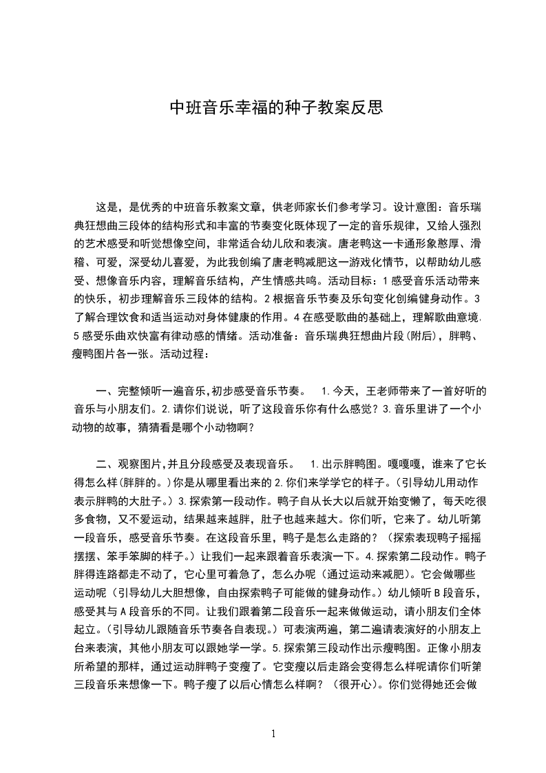 这是,是优秀的中班音乐教案文章,供老师家长们参考学习。设计意图:音乐瑞典狂想曲三段体的结构形式和丰富的节奏变化既体现了一定的音乐规律,又给人强烈的艺术感受和听觉想像空间,非常适合幼儿欣和表演。唐老鸭这一卡通形象憨厚、滑稽、可爱,深受幼儿喜爱,为此我创编了唐老鸭减肥这一游戏化情节,以帮助幼儿感受、想像音乐内容,理解音乐结构,产生情感共鸣。活动目标:1感受音乐活动带来的快乐,初步理解音乐三段体的结构。2根据音乐节奏及乐句变化创编健身动作。3了解合理饮食和适当运动对身体健康的作用。4在感受歌曲的基础上,理解歌曲意境。5感受乐曲欢快富有律动感的情绪。活动准备:音乐瑞典狂想曲片段(附后),胖鸭、瘦鸭图片各一张。活动过程: