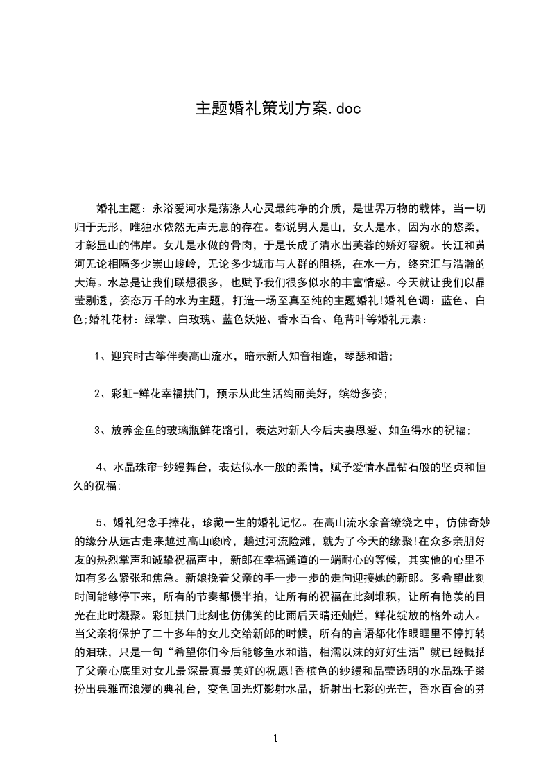 婚礼主题:永浴爱河水是荡涤人心灵最纯净的介质,是世界万物的载体,当一切归于无形,唯独水依然无声无息的存在。都说男人是山,女人是水,因为水的悠柔,才彰显山的伟岸。女儿是水做的骨肉,于是长成了清水出芙蓉的娇好容貌。长江和黄河无论相隔多少崇山峻岭,无论多少城市与人群的阻挠,在水一方,终究汇与浩瀚的大海。水总是让我们联想很多,也赋予我们很多似水的丰富情感。今天就让我们以晶莹剔透,姿态万千的水为主题,打造一场至真至纯的主题婚礼!婚礼色调:蓝色、白色;婚礼花材:绿掌、白玫瑰、蓝色妖姬、香水百合、龟背叶等婚礼元素: