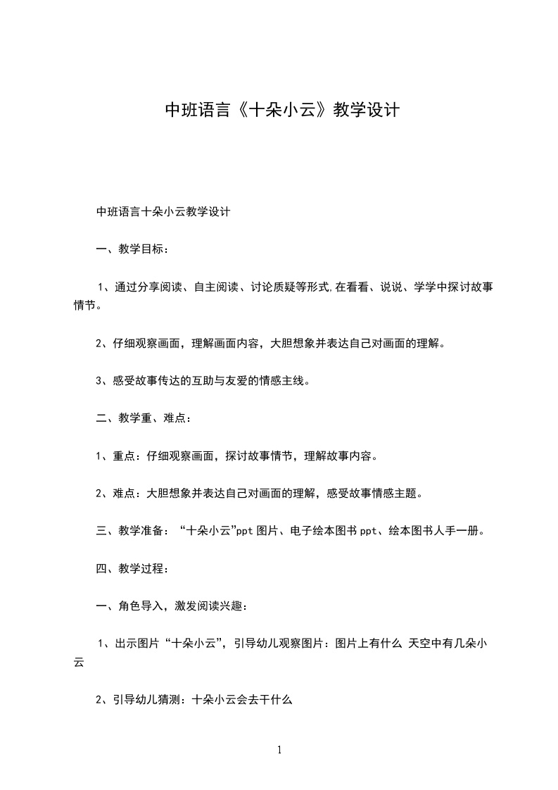 三、教学准备:“十朵小云”ppt图片、电子绘本图书ppt、绘本图书人手一册。