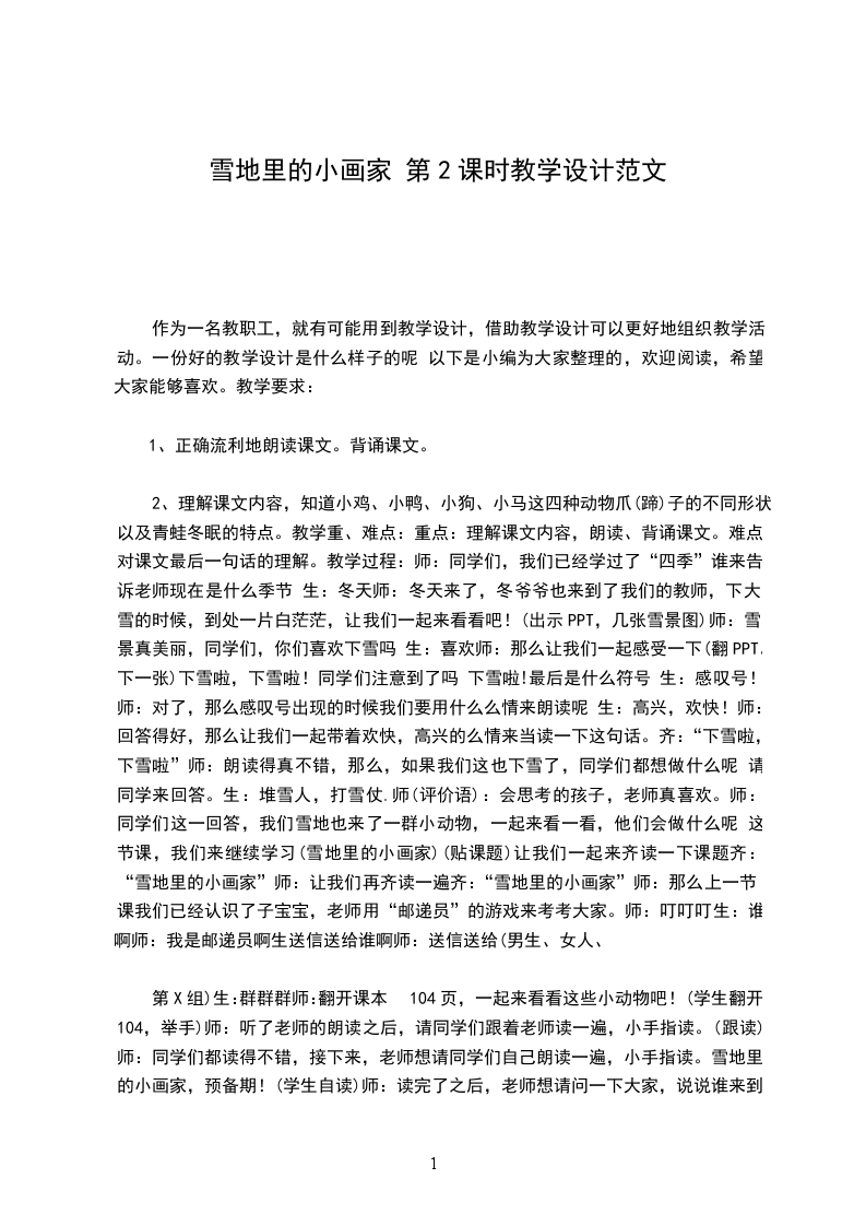 第X组)生:群群群师:翻开课本104页,一起来看看这些小动物吧!(学生翻开104,举手)师:听了老师的朗读之后,请同学们跟着老师读一遍,小手指读。(跟读)师:同学们都读得不错,接下来,老师想请同学们自己朗读一遍,小手指读。雪地里的小画家,预备期!(学生自读)师:读完了之后,老师想请问一下大家,说说谁来到雪地里了 在文中圈出来,全好的同学请举手!(学生圈)师:老师想请一位同学们来回答一下,课文中来了几位小画家 生:小鸡、小狗、小鸭、小马(学生边回答边贴卡片)师:咦 这几位小画家,他们分别都画了什么 老师想请一位同学上台将小画家们的作品对映好。(生上台贴作品)师:这位同学勇气可嘉,同学们,他粘对了吗 生:对了!师:号,谢谢这位同学。师:(指着黑板看作品)我们一起来看一下,小动物们和它们的作品,“小鸡画竹叶,小狗画梅花。小鸭画枫叶,小马画月牙。”师:咦 他们都是怎么画的呢 生:脚印师:那为什么小鸡画的师竹叶呢 因为(手指幻灯片)小鸡的脚印像竹叶所以小鸡画竹叶。(指PPT)全班齐:因为小狗的脚印像梅花,所以小狗画梅花.师:咦,那么小鸭和小马又是为什么这么画呢 老师请两位同学来回答。生:因为小鸭的脚印像枫叶,所以小鸭画枫叶师:这位同学有很认真的在思考老师的问题,回答的真好。再请一位同学告诉老师,小马是如何画的呢 生:因为小马的脚印像月牙,所以小马画月牙师:同学们他回答得对吗 (对)很好,善于思考的好孩子。师:这些小动物都用脚印来画画,所以不用颜料,不用笔。咦 这么多小动物来画画 为什么青蛙没来啊 生:因为他在动力睡着啦师:青蛙在洞里睡着啦,其实是他在冬眠,在漫长的冬天,美美的睡觉呢!那你们还知道那些小动物也会冬眠呢 老师请几位同学举手发言生:蛇、松鼠、狗熊、刺猬。师(评价语)有动脑筋思考的孩子看,就像刚才同学们回答的,蛇、熊、刺猬、松鼠,这些小动物们也要冬眠。雪地里的小画家多可爱呀!让我们在音乐声中一起来吧课文有感情的朗读一遍把!雪地里的小画家,预备,起。(PPT:带音乐)