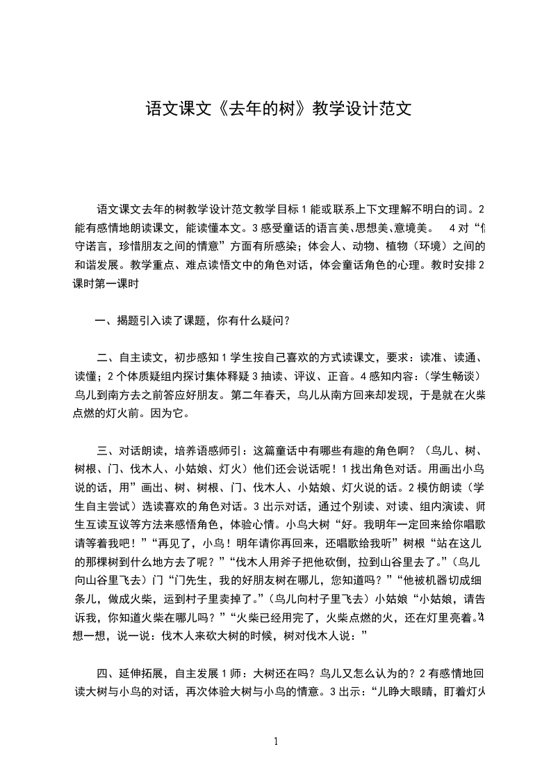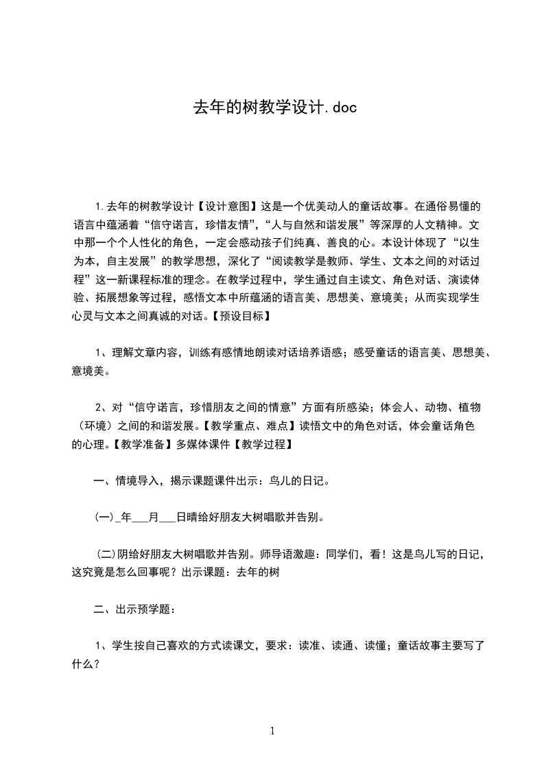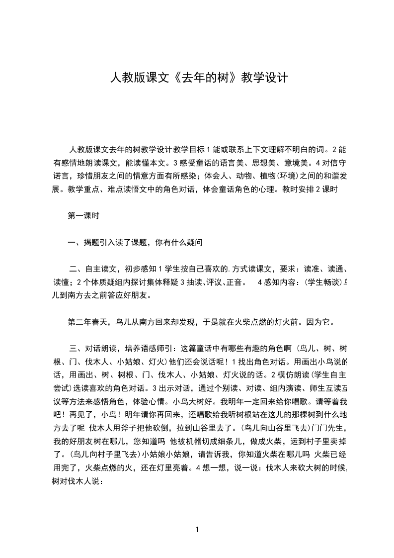 人教版课文去年的树教学设计教学目标1能或联系上下文理解不明白的词。2能有感情地朗读课文,能读懂本文。3感受童话的语言美、思想美、意境美。4对信守诺言,珍惜朋友之间的情意方面有所感染;体会人、动物、植物(环境)之间的和谐发展。教学重点、难点读悟文中的角色对话,体会童话角色的心理。教时安排2课时