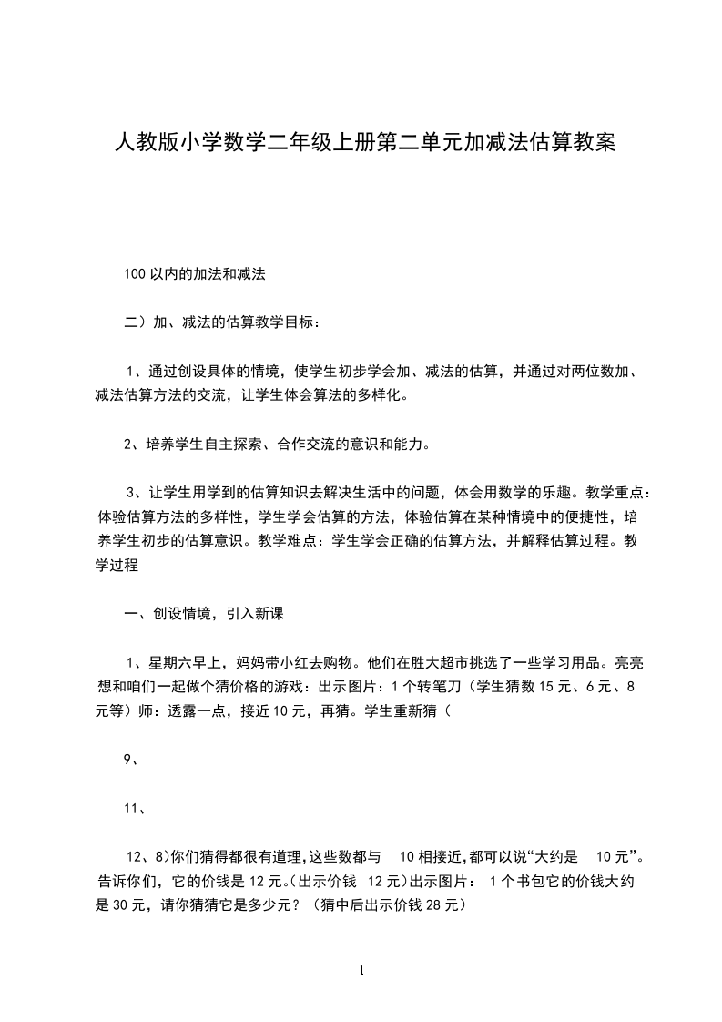 1、通过创设具体的情境,使学生初步学会加、减法的估算,并通过对两位数加、减法估算方法的交流,让学生体会算法的多样化。