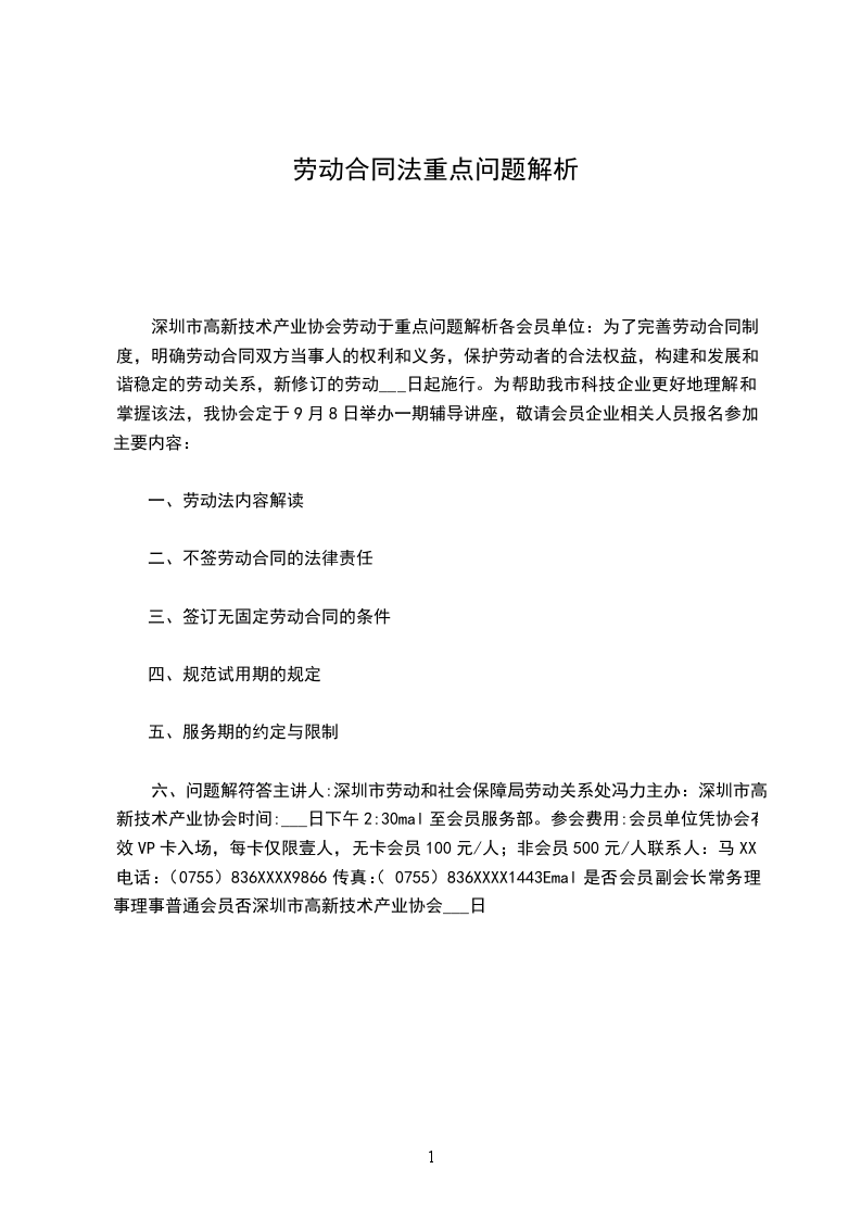 六、问题解符答主讲人:深圳市劳动和社会保障局劳动关系处冯力主办:深圳市高新技术产业协会时间:___日下午2:30mal至会员服务部。参会费用:会员单位凭协会有效VP卡入场,每卡仅限壹人,无卡会员100元/人;非会员500元/人联系人:马XX电话:(0755)836XXXX9866传真:(0755)836XXXX1443Emal是否会员副会长常务理事理事普通会员否深圳市高新技术产业协会___日