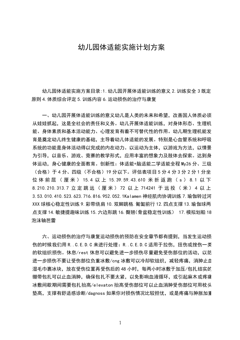 幼儿园体适能实施方案目录:1.幼儿园开展体适能训练的意义2.训练安全3既定原则4.体质综合评定5.训练内容6.运动损伤的治疗与康复