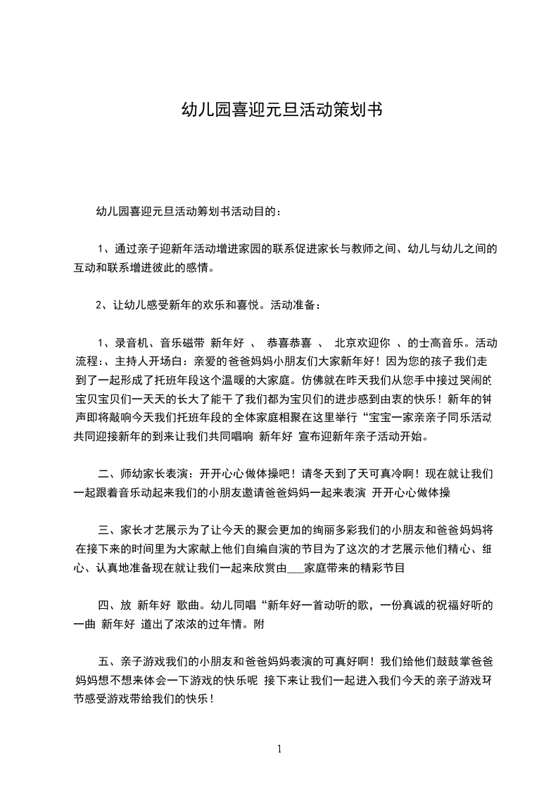 1、通过亲子迎新年活动增进家园的联系促进家长与教师之间、幼儿与幼儿之间的互动和联系增进彼此的感情。