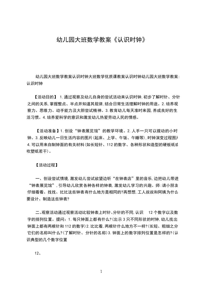 幼儿园大班数学教案认识时钟大班数学优质课教案认识时钟幼儿园大班数学教案:认识时钟
