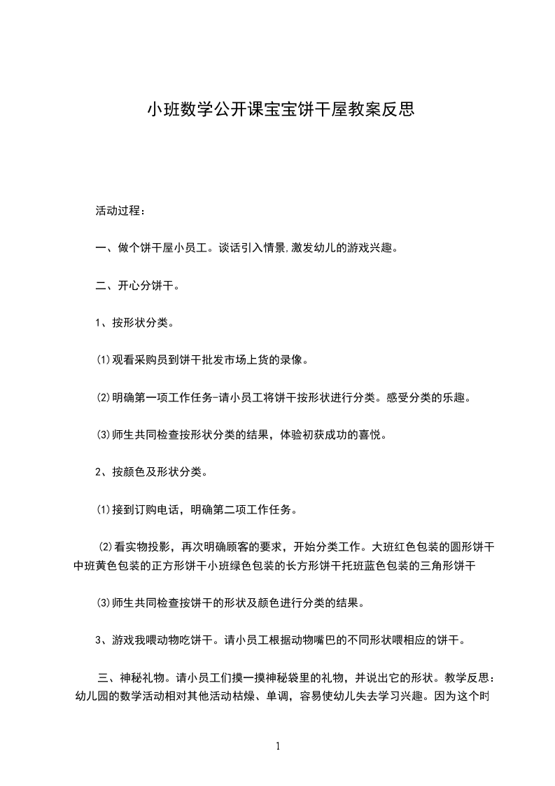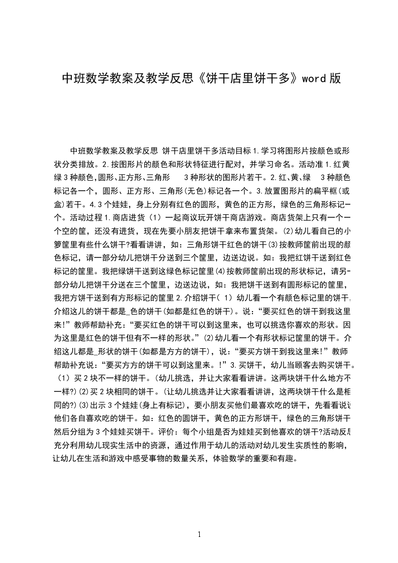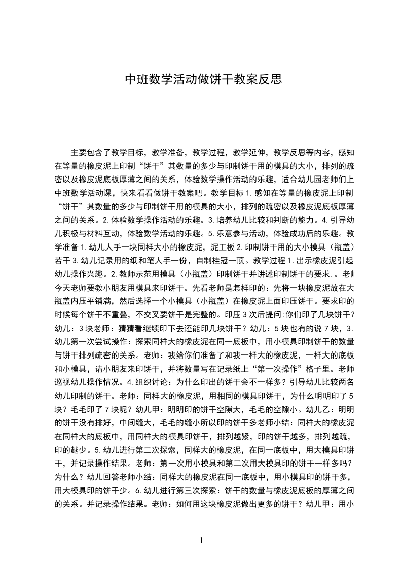 主要包含了教学目标,教学准备,教学过程,教学延伸,教学反思等内容,感知在等量的橡皮泥上印制“饼干”其数量的多少与印制饼干用的模具的大小,排列的疏密以及橡皮泥底板厚薄之间的关系,体验数学操作活动的乐趣,适合幼儿园老师们上中班数学活动课,快来看看做饼干教案吧。教学目标1.感知在等量的橡皮泥上印制“饼干”其数量的多少与印制饼干用的模具的大小,排列的疏密以及橡皮泥底板厚薄之间的关系。2.体验数学操作活动的乐趣。3.培养幼儿比较和判断的能力。4.引导幼儿积极与材料互动,体验数学活动的乐趣。5.乐意参与活动,体验成功后的乐趣。教学准备1.幼儿人手一块同样大小的橡皮泥,泥工板2.印制饼干用的大小模具(瓶盖)若干3.幼儿记录用的纸和笔人手一份,自制桂冠一顶。教学过程1.出示橡皮泥引起幼儿操作兴趣。2.教师示范用模具(小瓶盖)印制饼干并讲述印制饼干的要求.。老师:今天老师要教小朋友用模具来印饼干。先看老师是怎样印的:先将一块橡皮泥放在大瓶盖内压平铺满,然后选择一个小模具(小瓶盖)在橡皮泥上面印压饼干。要求印的时候每个饼干不重叠,不交叉要饼干是完整的。印压3次后提问:你们印了几块饼干?幼儿:3块老师:猜猜看继续印下去还能印几块饼干?幼儿:5块也有的说7块,3.幼儿第一次尝试操作:探索同样大的橡皮泥在同一底板中,用小模具印制饼干的数量与饼干排列疏密的关系。老师:我给你们准备了和我一样大的橡皮泥,一样大的底板和小模具,请小朋友来印饼干,并将数量写在记录纸上“第一次操作”格子里。老师巡视幼儿操作情况。4.组织讨论:为什么印出的饼干会不一样多?引导幼儿比较两名幼儿印制的饼干。老师:同样大的橡皮泥,用相同的模具印饼干,为什么明明印了5块?毛毛印了7块呢?幼儿甲:明明印的饼干空隙大,毛毛的空隙小。幼儿乙:明明的饼干没有排好,中间缝大,毛毛的缝小所以印的饼干多老师小结:同样大的橡皮泥,在同样大的底板中,用同样大的模具印饼干,排列越紧,印的饼干越多,排列越疏,印的越少。5.幼儿进行第二次探索,同样大的橡皮泥,在同一底板中,用大模具印饼干,并记录操作结果。老师:第一次用小模具和第二次用大模具印的饼干一样多吗?为什么?幼儿回答老师小结:同样大的橡皮泥在同一底板中,用小模具印的饼干多,用大模具印的饼干少。6.幼儿进行第三次探索:饼干的数量与橡皮泥底板的厚薄之间的关系。并记录操作结果。老师:如何用这块橡皮泥做出更多的饼干?幼儿甲:用小模具做饼干。幼儿乙:饼干排列紧密可以多做一些。老师:还有没有别的办法?如果用泥工板做底板,把橡皮泥放在泥工板上印饼干,会不会印的多呢?幼儿尝试操作,教师巡回观察老师小结:同样大的橡皮泥在泥工板上弄的越薄(面积越大)做出的饼干越多。7.游戏竞赛:争夺桂冠教师出示自制的桂冠,引起幼儿竞赛兴趣。老师:看谁能用这块橡皮泥做出更多的饼干老师就把这顶桂冠戴在谁的头上。教师巡视幼儿操作情况,及时发现冠军,引导幼儿讲述他的制作方法,将桂冠带在得冠军的小朋友的头上。鼓励大家课后要想出更好的办法争取下次夺冠。教学延伸在数学区域内提供橡皮泥,泥工板,大小不等的模具等,供幼儿继续探索,进一步感知饼干的数量与模具的大小,排列的疏密及橡皮泥的厚薄之间的关系。幼儿操作时教师巡回观察,让幼儿充分体验自主学习,探索,记数的乐趣。教学反思操作是幼儿学习,建构数学知识的基本方法。因此提供有效的操作材料是活动成功的重要因素。这节课活动材料都是幼儿喜欢摆弄的橡皮泥和大小不等的瓶盖。教师让幼儿在操作中逐步感知;用等量的橡皮泥做饼干,其数量的多少与选择模具大小,排列的疏密,橡皮泥底板的厚薄(面积)的关系。将抽象的数学知识具体化,浅显化,易于幼儿理解和掌握。活动中教师注重既面向全体幼儿让每个幼儿都参与操作,始终关注每个幼儿的操作情况,又及时鼓励有创新能力的幼儿,使每个幼儿在参与的过程中充分体验到数学学习的乐趣,获得心智的发展。
