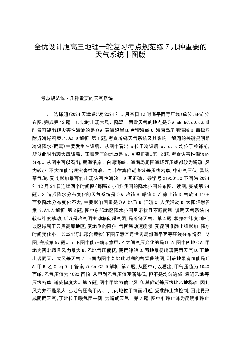 一、 选择题(2024天津卷)读2024年5月某日12时海平面等压线(单位:hPa)分布图,完成第12题。1.此时出现大风、降温、雨雪天气的地点是()A.aB.bC.cD.d2.此时最可能出现灾害性海浪的是()A.黄海沿岸B.台湾海峡C.海南岛周围海域D.菲律宾附近海域答案:1.A2.D解析:第1题,考查冷锋天气系统及其影响。解题的关键是明确冷锋降水(雨雪)主要发生在锋后。从图中看出,a位于冷锋后,b、c、d均位于冷锋前,所以此时出现大风降温、雨雪天气的地点是a。A项正确。第2题,考查灾害性海浪的分布。从图中可以看出,黄海沿岸、台湾海峡、海南岛周围海域等压线都较为稀疏,风力较小,不大可能出现灾害性海浪。而菲律宾附近海域等压线密集,中心气压低,属热带气旋,受其影响最可能出现灾害性海浪。D项正确。导学号21950150下图为2024年12月34日连续四个时间段(每隔6小时)我国的降水范围分布图。读图,完成第34题。3.造成降水分布变化的天气系统是()A.冷锋B.暖锋C.准静止锋D.气旋4.110E西侧降水分布变化不大,主要影响因素是()A.地形B.洋流C.人类活动D.太阳辐射答案:3.A4.A解析:第3题,图中东部地区降水范围呈带状且不断南移,说明天气系统向较低纬度移动,所以是冷气团主动移向暖气团,是冷锋天气。第4题,根据经纬度判断,该区域属于云贵高原地区,受地形的阻挡,气团移动速度慢,受昆明准静止锋影响,降水时间变化小。(2024河北邢台质检)下图示意某月世界局部海平面等压线分布情况。读图,完成第57题。5.下图中能正确示意甲、乙之间气压变化的是()6.图中四地()A.甲地为西北风且风力最大B.乙地气压偏低,阴雨绵绵C.丙地最易出现阴雨天气D.丁地出现阴天、大风等天气7.下面为图中某地此时期的气温曲线图,则该地最有可能是()A.甲B.乙C.丙D.丁答案:5.C6.C7.D解析:第5题,从图中可以看出,甲气压值为1040百帕,乙气压值为1030百帕,从甲到乙气压值逐渐降低,但不是均匀递减,靠近乙地等压线密集,递减幅度大。第6题,图中甲地为偏北风,但其附近等压线比乙地稀疏,因此风力并不是最大;乙地气压高于丙、丁;丙地位于锋面附近,受准静止锋控制,因此易形成阴雨天气;丁地位于暖气团一侧,为晴朗天气。第7题,图中准静止锋为昆明准静止锋,出现在冬季。图中所示该地最低气温在0以上,最高气温在17左右,且30天内变化幅度很小,说明该地可能受单一暖气团控制,因此最可能是丁地。(2024山东临沂二模)读我国北方部分区域某时刻的空气质量分布及趋势图,完成第89题。8.此时区域内有一次明显锋面活动,其锋线位置最可能位于图中的()A.a线附近B.b线附近C.c线附近D.d线附近9.石家庄此时的PM2.5指数高达890。下列对该地污染严重的原因分析,合理的是()A.冷暖气流交汇,湿度增大,污染物大量集聚B.暖空气推进,冷气流下沉,污染物集聚地表C.冷暖空气相遇,挤压气流,污染物浓度升高D.气旋影响,周围大气污染物聚合,浓度升高答案:8.B9.C解析:第8题,冷锋天气系统能够带来大风天气,有利于污染物的扩散,能够改善大气的质量。图中显示北京及以北地区的城市大气质量优良,且有向好的趋势,b线以南城市大气质量很差,个别城市趋势向差,据此可推测冷锋锋面的锋线在b线附近。第9题,冷空气势力较强,主动向偏南方向移动,会在锋线附近的区域水平压缩近地面的空气,也就压缩了污染物,使得局部地区的污染物浓度升高。(2024北京东城二模)下图为某日某区域等压线(单位:百帕)图。读图,完成第10题。10.此时图中()A.我国北方受高压控制,多晴朗微风天气B.太平洋海域受低压控制,多暴风雨C.台湾海峡吹偏北风,海上船只注意安全D.日本群岛受暖锋影响,出现连续性降水答案:C解析:我国北方大部分地区等压线密集,多大风天气;在日本以东太平洋上为高压中心;台湾海峡此时吹偏北风,等压线密集,风力较大;日本南部大部分受冷锋系统控制。(2024甘肃兰州质检)下图为南半球某区域近地面1000百帕等压面上的等高线(单位:米)分布图。读图,完成第1112题。11.对图示区域天气现象的说法,正确的是()A.P地的风向为西南风B.N地气流以上升运动为主C.M地为阴雨天气D.M地为高压中心12.影响Q地的天气系统和天气特征分别是()A.暖锋晴朗B.冷锋阴雨C.气旋阴雨D.反气旋晴朗答案:11.D12.B解析:第11题,P地的风向为西北风,N地气流以下沉运动为主;M地为晴朗天气;M地为高压中心。第12题,Q地位于偏西方向伸出的低压槽,为冷锋锋面,出现阴雨天气。(2024山东济宁二模)2024年1月,美国东北部地区遭受了历史上最强暴雪的袭击。下图为2024年1月27日北美部分地区天气形势图。读图,完成第1314题。13.图中等压线a与b的数值大小关系及c处的风向分别为()A.ab东北风B.ab东南风D.ab西南风14.本次暴雪强度大、时间长、范围广,主要原因是()A.多个天气系统的叠加影响B.冷暖气团势力相当,滞留时间长C.暖气团势力强,水汽多D.五大湖完全封冻,降温作用明显答案:13.D14.A解析:第13题,锋面形成于低压系统中,故a气压值小于b;c处位于低压中心附近,根据风的形成原理(由高压流向低压,并受北半球地转偏向力和摩擦力影响后右偏)判断,c处为西南风。第14题,美国地形东西高,中部为平原,冬季从北冰洋来的冷空气与来自大西洋的暖湿气流相遇形成锋面气旋,产生暴风雪,与图中显示的多个冷锋同时影响美国东北部地区。导学号21950151