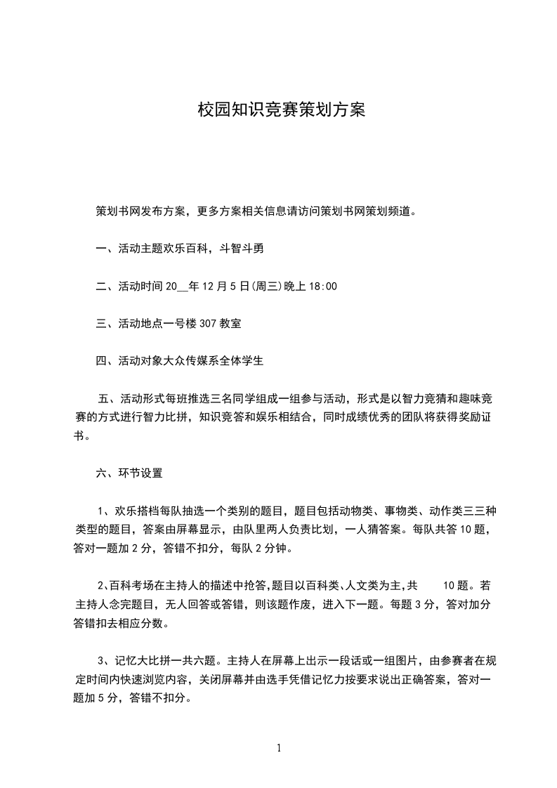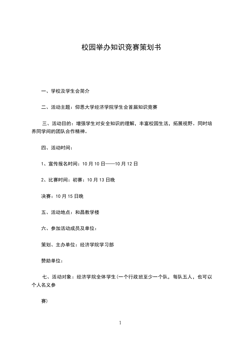 4、各二级学院观众及参赛代表队选手请提前10分钟进场,并在指定位置就座;各二级学院学生会负责维持本学院观众纪律,可打出活动相关标语或宣传牌。校园安全知识竞赛活动策划篇二一、活动前言:校园安全问题一直都是社会各界关注的热点问题。校园安全与每个师生、家长和社会有着切身的关系,它直接关系到在校学生能否安全健康的成长,关系到千千万万个家庭的幸福安宁和社会稳定。鉴于此,师范大学大学生志愿者服务中心面向全校举办校园安全知识竞赛,以增加学生校园安全知识,促进建设和谐校园。二、活动目的:意外伤害不仅造成大量的残疾和早亡,消耗巨大的医疗费用,而且削弱了国民生产力;不仅给孩子和家庭带来痛苦和不幸,而且给社会、政府及学校造成巨大的损失和负担。为了减少或避免学生们遭遇不必要的伤害与损失,加强学生对校园安全知识的掌握,促进和谐校园的建设,师范大学大学生服务中心消防部面向全校举办校园安全知识竞赛。三、活动时间:复赛时间于20年月日(星期三)决赛时间于20年月日(星期六)暂定四、活动地点:复赛地点师范大学教室决赛地点图书馆报告厅五、活动对象:师范大学(校区)在校学生六、活动筹备: