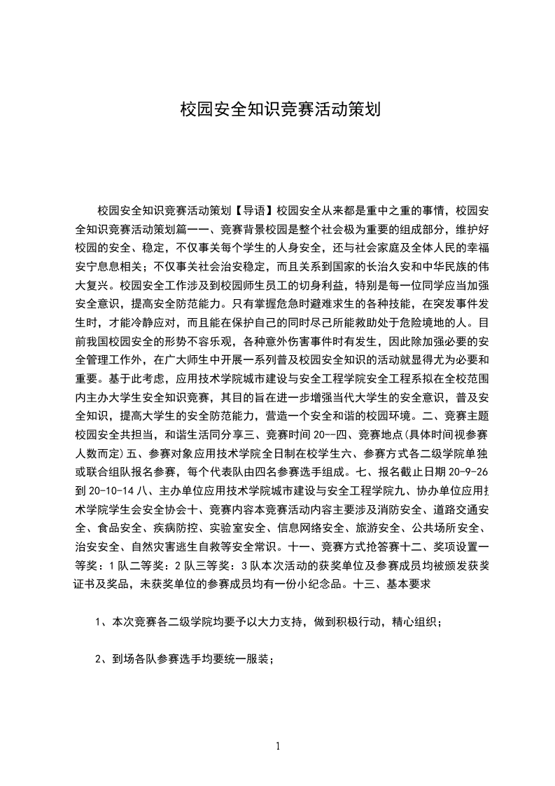 校园安全知识竞赛活动策划【导语】校园安全从来都是重中之重的事情,校园安全知识竞赛活动策划篇一一、竞赛背景校园是整个社会极为重要的组成部分,维护好校园的安全、稳定,不仅事关每个学生的人身安全,还与社会家庭及全体人民的幸福安宁息息相关;不仅事关社会治安稳定,而且关系到国家的长治久安和中华民族的伟大复兴。校园安全工作涉及到校园师生员工的切身利益,特别是每一位同学应当加强安全意识,提高安全防范能力。只有掌握危急时避难求生的各种技能,在突发事件发生时,才能冷静应对,而且能在保护自己的同时尽己所能救助处于危险境地的人。目前我国校园安全的形势不容乐观,各种意外伤害事件时有发生,因此除加强必要的安全管理工作外,在广大师生中开展一系列普及校园安全知识的活动就显得尤为必要和重要。基于此考虑,应用技术学院城市建设与安全工程学院安全工程系拟在全校范围内主办大学生安全知识竞赛,其目的旨在进一步增强当代大学生的安全意识,普及安全知识,提高大学生的安全防范能力,营造一个安全和谐的校园环境。二、竞赛主题校园安全共担当,和谐生活同分享三、竞赛时间20--四、竞赛地点(具体时间视参赛人数而定)五、参赛对象应用技术学院全日制在校学生六、参赛方式各二级学院单独或联合组队报名参赛,每个代表队由四名参赛选手组成。七、报名截止日期20-9-26到20-10-14八、主办单位应用技术学院城市建设与安全工程学院九、协办单位应用技术学院学生会安全协会十、竞赛内容本竞赛活动内容主要涉及消防安全、道路交通安全、食品安全、疾病防控、实验室安全、信息网络安全、旅游安全、公共场所安全、治安安全、自然灾害逃生自救等安全常识。十一、竞赛方式抢答赛十二、奖项设置一等奖:1队二等奖:2队三等奖:3队本次活动的获奖单位及参赛成员均被颁发获奖证书及奖品,未获奖单位的参赛成员均有一份小纪念品。十三、基本要求