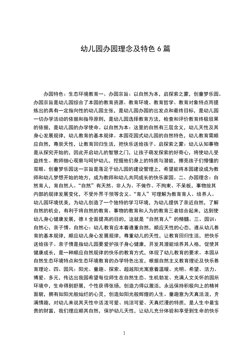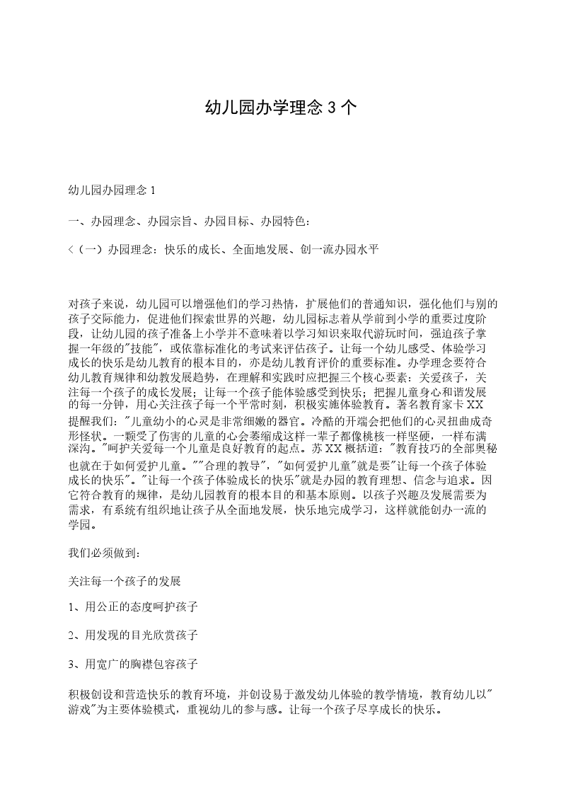 <(一)办园理念:快乐的成长、全面地发展、创一流办园水平对孩子来说,幼儿园可以增强他们的学习热情,扩展他们的普通知识,强化他们与别的孩子交际能力,促进他们探索世界的兴趣,幼儿园标志着从学前到小学的重要过度阶段,让幼儿园的孩子准备上小学并不意味着以学习知识来取代游玩时间,强迫孩子掌握一年级的"技能",或依靠标准化的考试来评估孩子。让每一个幼儿感受、体验学习成长的快乐是幼儿教育的根本目的,亦是幼儿教育评价的重要标准。办学理念要符合幼儿教育规律和幼教发展趋势,在理解和实践时应把握三个核心要素:关爱孩子,关注每一个孩子的成长发展;让每一个孩子能体验感受到快乐;把握儿童身心和谐发展的每一分钟,用心关注孩子每一个平常时刻,积极实施体验教育。著名教育家卡XX提醒我们:"儿童幼小的心灵是非常细嫩的器官。冷酷的开端会把他们的心灵扭曲成奇形怪状。一颗受了伤害的儿童的心会萎缩成这样一辈子都像桃核一样坚硬,一样布满深沟。"呵护关爱每一个儿童是良好教育的起点。苏XX概括道:"教育技巧的全部奥秘也就在于如何爱护儿童。""合理的教导","如何爱护儿童"就是要"让每一个孩子体验成长的快乐"。"让每一个孩子体验成长的快乐"就是办园的教育理想、信念与追求。因它符合教育的规律,是幼儿园教育的根本目的和基本原则。以孩子兴趣及发展需要为需求,有系统有组织地让孩子从全面地发展,快乐地完成学习,这样就能创办一流的学园。