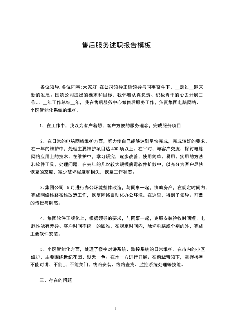 四、存在不足问题和今后努力方向担任售后服务经理后,我认真努力工作,虽然售后服务水平有所提高,取得良好成绩,但还是存在一定的不足问题,主要是自己专业技术知识和工作业务技能还不够高,有些售后服务工作还没有完全做到位,这些不足问题需要在今后工作中切实加以改进和提高。进入20__年,我要按照公司工作精神和自己职责范围,努力做到三点:是加强学习,提高自己的业务工作技能,进一步做好自己的本职工作。二是勤奋工作,全面完成工作任务,提高工作效率和工作质量,为客户提供更加优质的服务。三是加强作风建设,严格执行公司的工作精神和工作纪律,积极做好各项工作,服务公司健康、持续发展。我的述职报告完了,谢谢大家!篇二】算一算已来公司十年多了,回顾过去,虽然取得了不错的成绩,但有很多不足之处,现在都不说了,因为它已成为过去。我自从来公司一直负责广告产品和电视购物方面,但由于政策和多种原因,20__年已经无再做,现在我被安排在售后部,把我在售后部一个多月里所看到的和自己的想法做以下陈述;