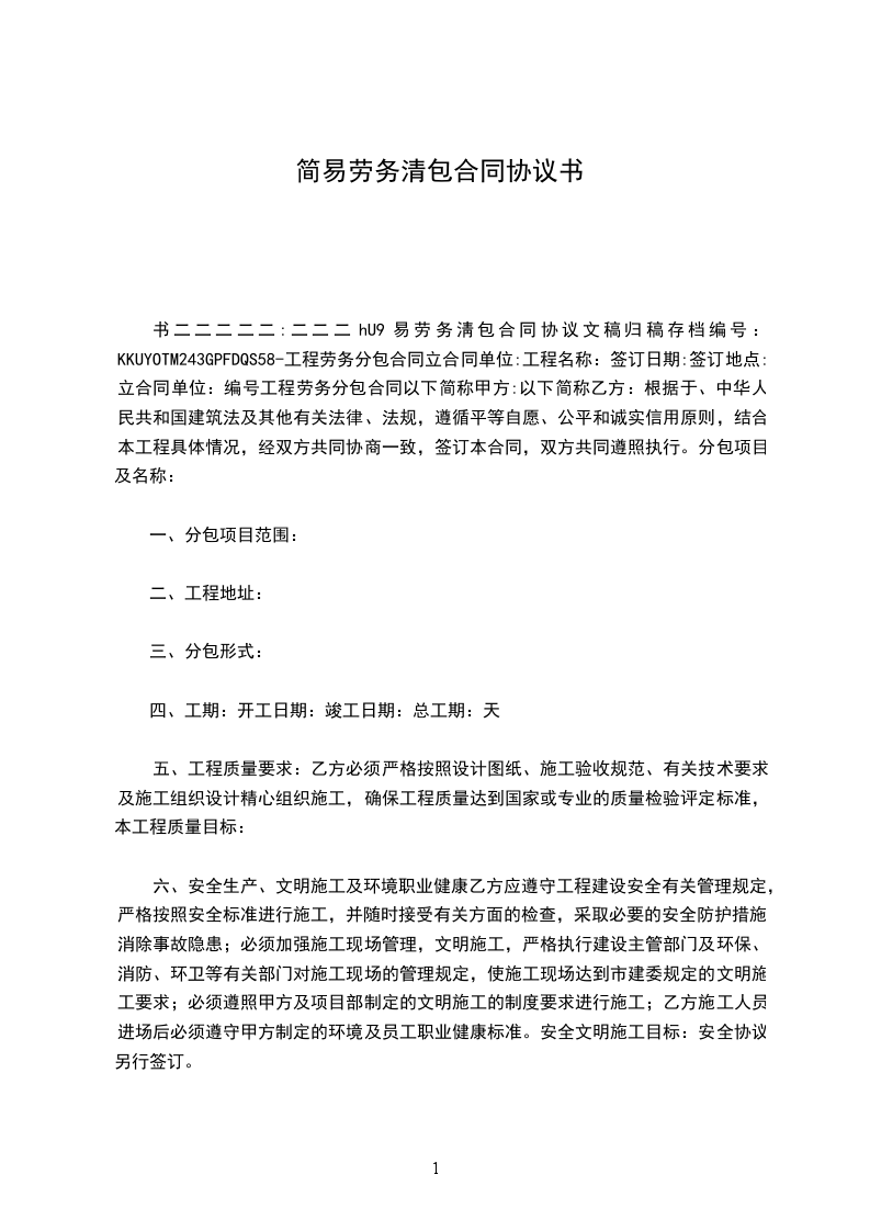 书二二二二二:二二二hU9易劳务淸包合同协议文稿归稿存档编号:KKUYOTM243GPFDQS58-工程劳务分包合同立合同单位:工程名称:签订日期:签订地点:立合同单位:编号工程劳务分包合同以下简称甲方:以下简称乙方:根据于、中华人民共和国建筑法及其他有关法律、法规,遵循平等自愿、公平和诚实信用原则,结合本工程具体情况,经双方共同协商一致,签订本合同,双方共同遵照执行。分包项目及名称: