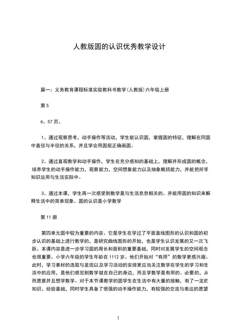 1、通过观察思考,动手操作等活动,学生能认识圆,掌握圆的特征,理解在同圆中直径与半径的关系,并且学会用圆规正确画圆。