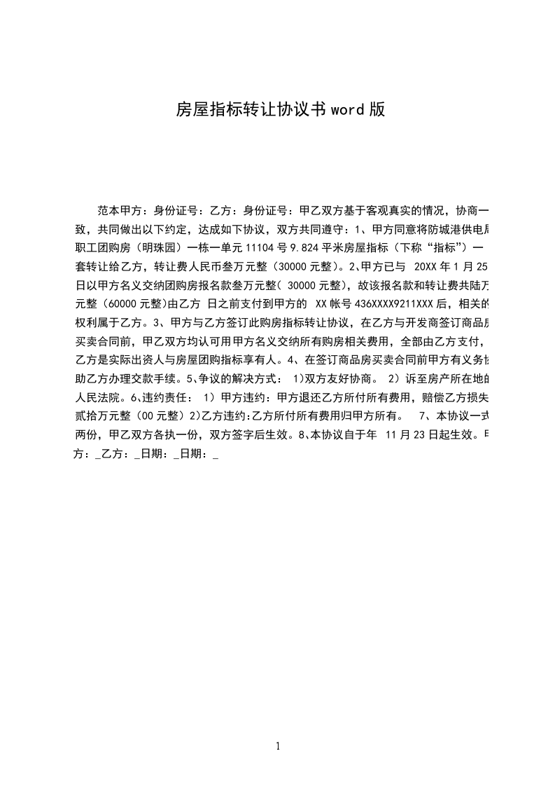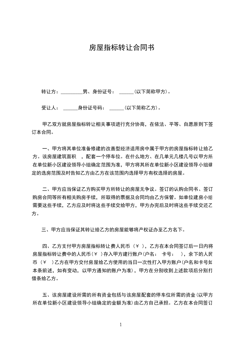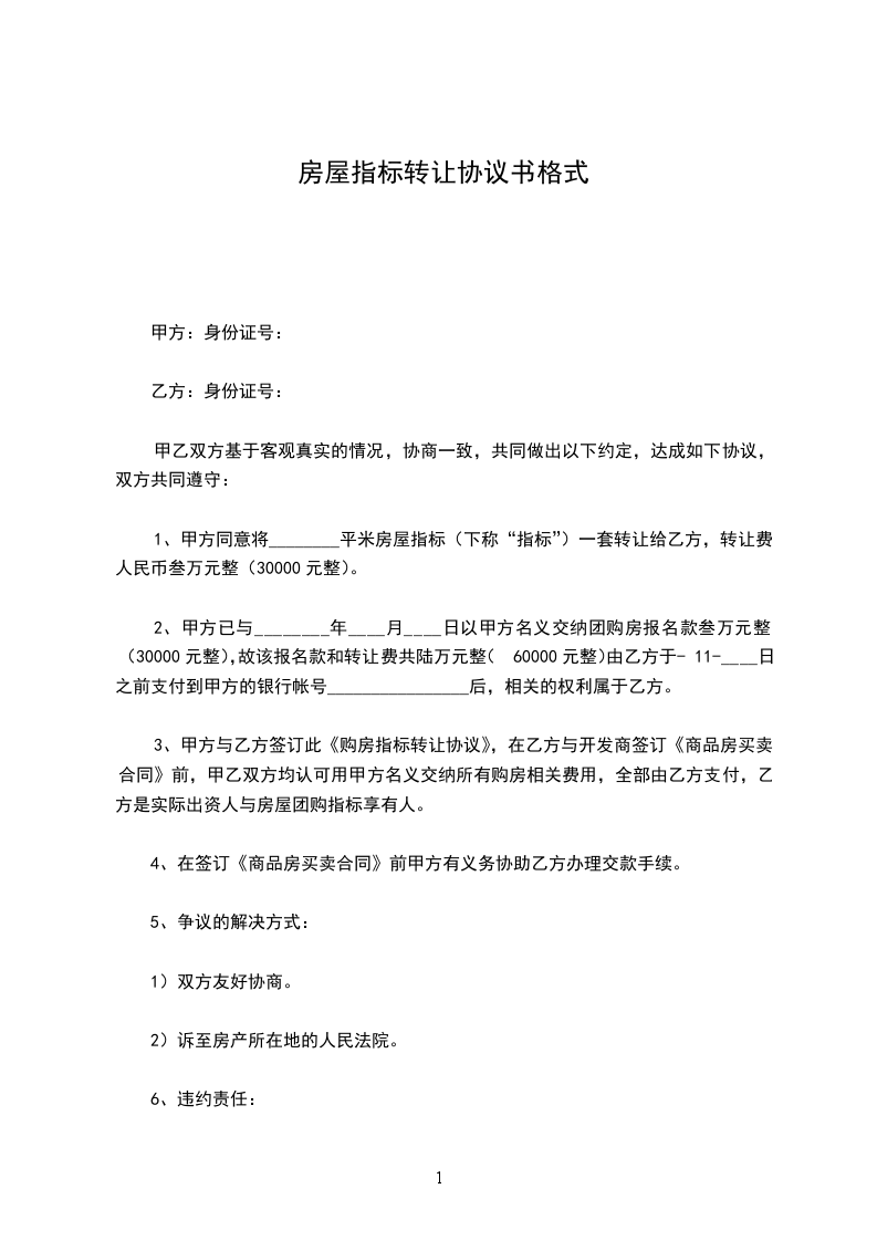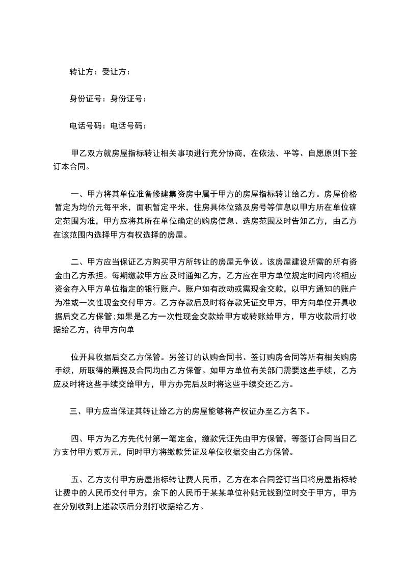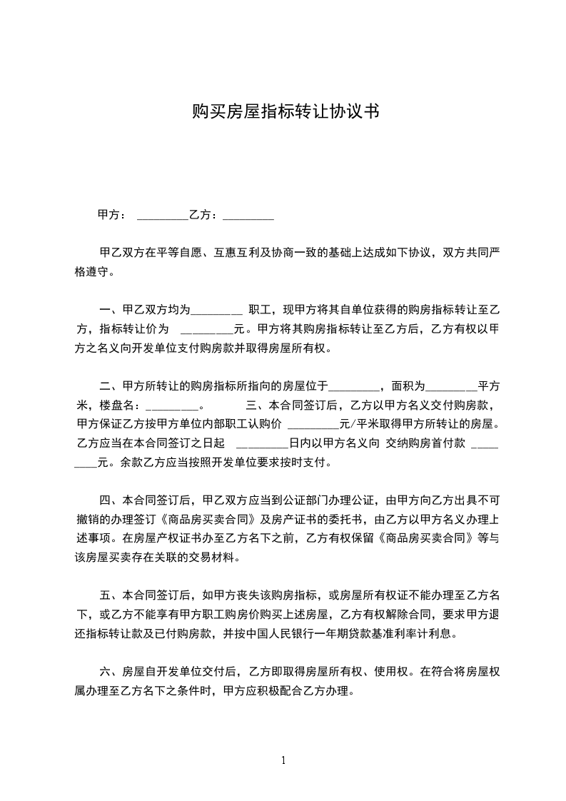 1、甲方同意将________平米房屋指标(下称“指标”)一套转让给乙方,转让费人民币叁万元整(30000元整)。