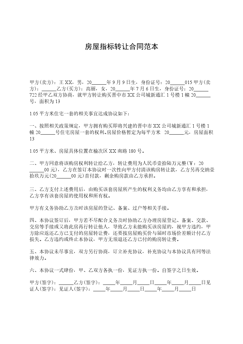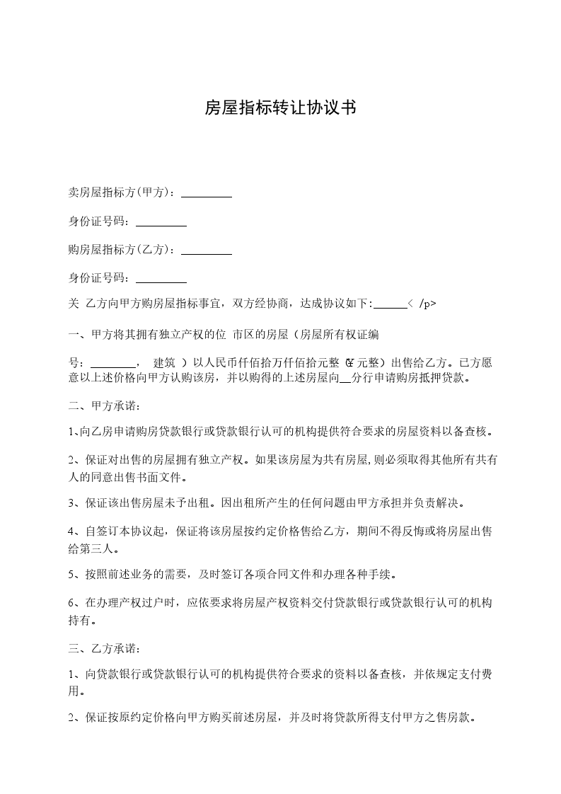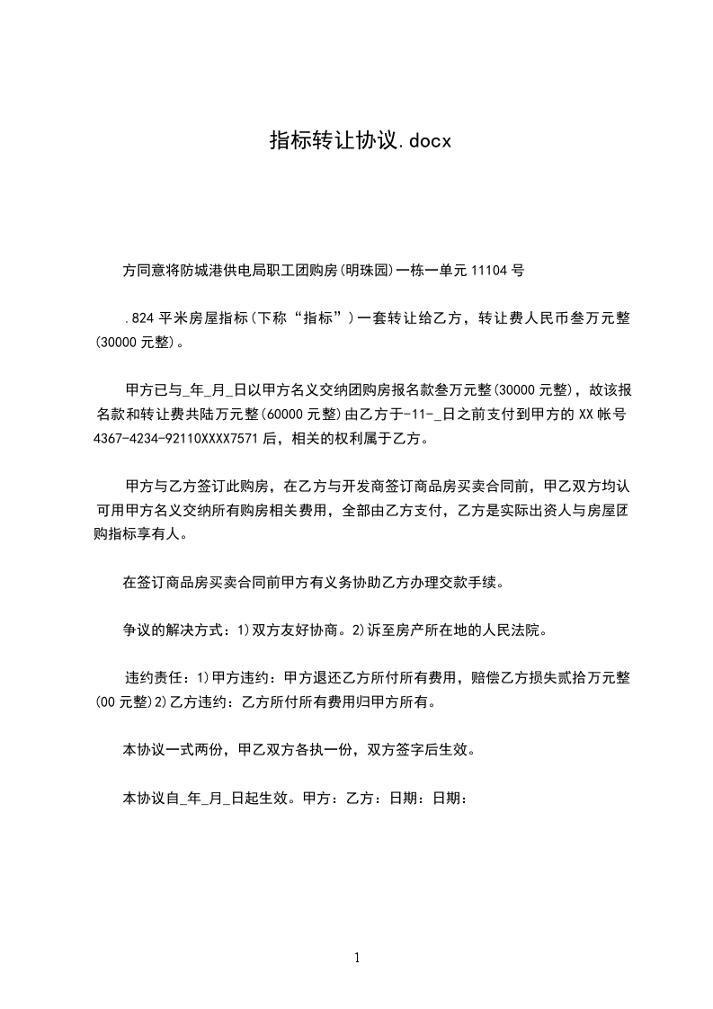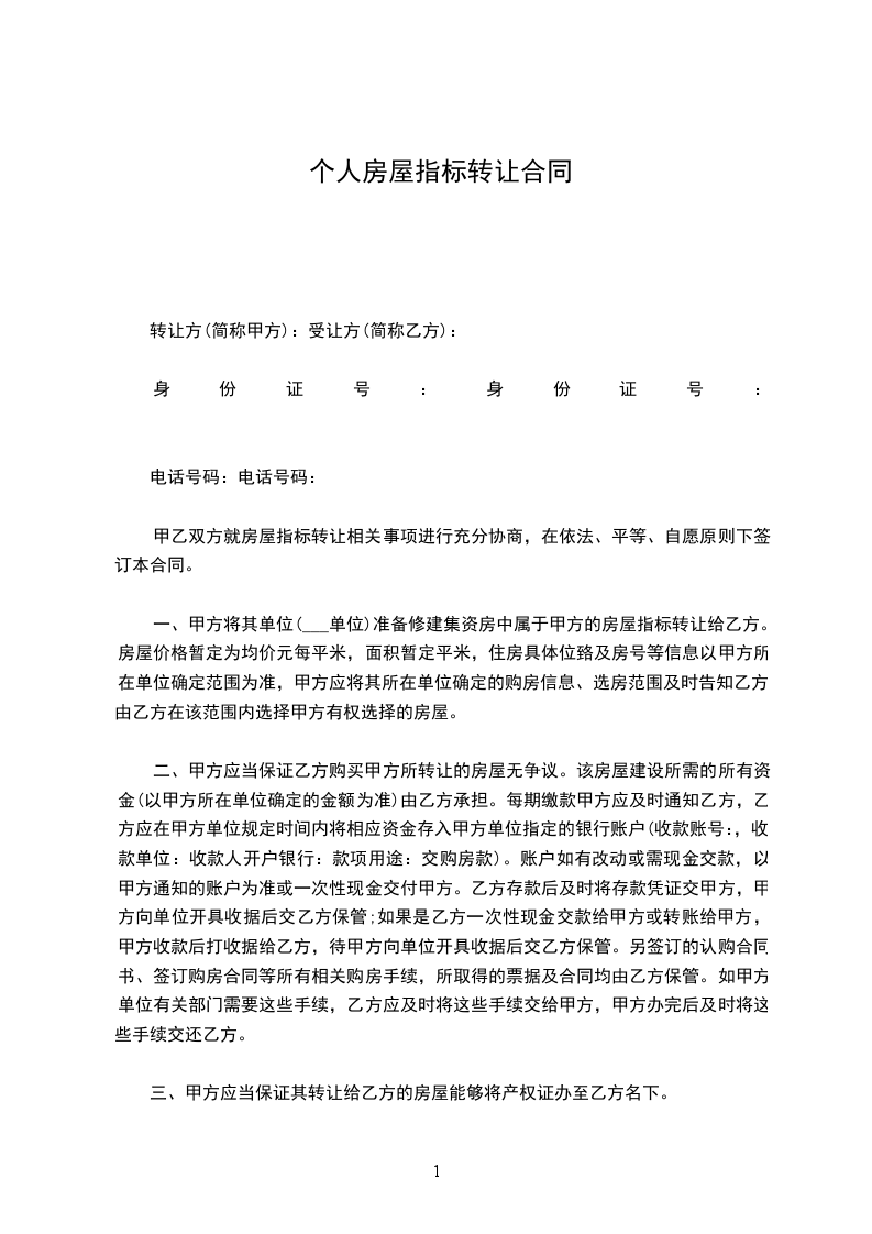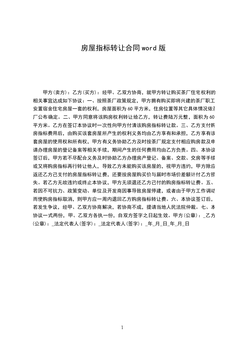 1、甲方同意将________平米房屋指标(下称“指标”)一套转让给乙方,转让费人民币叁万元整(30000元整)。