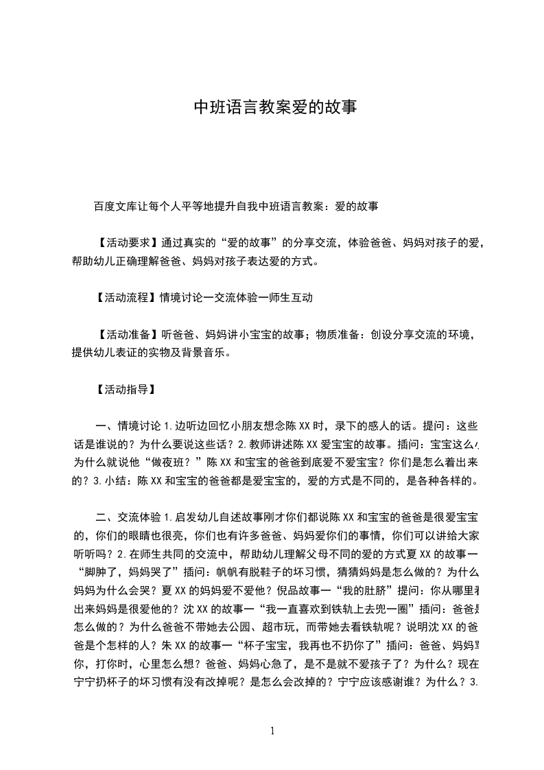二、交流体验1启发幼儿自述故事刚才你们都说陈XX和宝宝的爸爸是很爱宝宝的,你们的眼睛也很亮,你们也有许多爸爸、妈妈爱你们的事情,你们可以讲给大家听听吗?2在师生共同的交流中,帮助幼儿理解父母不同的爱的方式