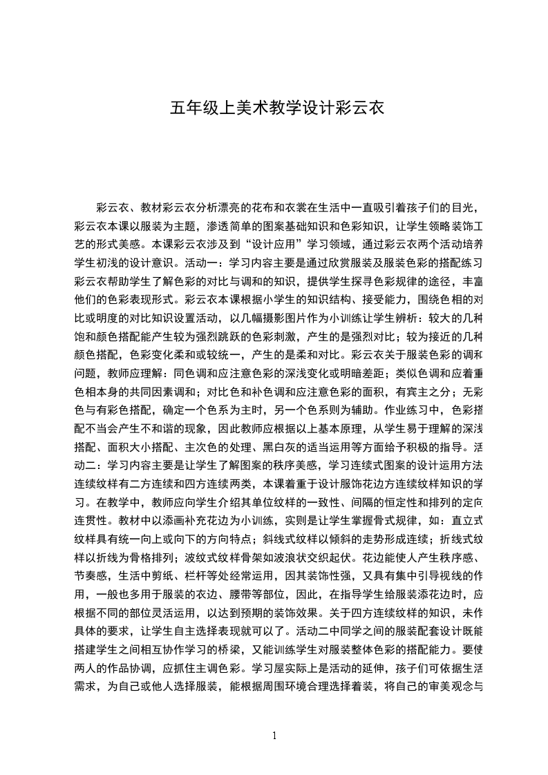 彩云衣、教材彩云衣分析漂亮的花布和衣裳在生活中一直吸引着孩子们的目光,彩云衣本课以服装为主题,渗透简单的图案基础知识和色彩知识,让学生领略装饰工艺的形式美感。本课彩云衣涉及到“设计应用”学习领域,通过彩云衣两个活动培养学生初浅的设计意识。活动一:学习内容主要是通过欣赏服装及服装色彩的搭配练习,彩云衣帮助学生了解色彩的对比与调和的知识,提供学生探寻色彩规律的途径,丰富他们的色彩表现形式。彩云衣本课根据小学生的知识结构、接受能力,围绕色相的对比或明度的对比知识设置活动,以几幅摄影图片作为小训练让学生辨析:较大的几种饱和颜色搭配能产生较为强烈跳跃的色彩刺激,产生的是强烈对比;较为接近的几种颜色搭配,色彩变化柔和或较统一,产生的是柔和对比。彩云衣关于服装色彩的调和问题,教师应理解:同色调和应注意色彩的深浅变化或明暗差距;类似色调和应着重色相本身的共同因素调和;对比色和补色调和应注意色彩的面积,有宾主之分;无彩色与有彩色搭配,确定一个色系为主时,另一个色系则为辅助。作业练习中,色彩搭配不当会产生不和谐的现象,因此教师应根据以上基本原理,从学生易于理解的深浅搭配、面积大小搭配、主次色的处理、黑白灰的适当运用等方面给予积极的指导。活动二:学习内容主要是让学生了解图案的秩序美感,学习连续式图案的设计运用方法。连续纹样有二方连续和四方连续两类,本课着重于设计服饰花边方连续纹样知识的学习。在教学中,教师应向学生介绍其单位纹样的一致性、间隔的恒定性和排列的定向连贯性。教材中以添画补充花边为小训练,实则是让学生掌握骨式规律,如:直立式纹样具有统一向上或向下的方向特点;斜线式纹样以倾斜的走势形成连续;折线式纹样以折线为骨格排列;波纹式纹样骨架如波浪状交织起伏。花边能使人产生秩序感、节奏感,生活中剪纸、栏杆等处经常运用,因其装饰性强,又具有集中引导视线的作用,一般也多用于服装的衣边、腰带等部位,因此,在指导学生给服装添花边时,应根据不同的部位灵活运用,以达到预期的装饰效果。关于四方连续纹样的知识,未作具体的要求,让学生自主选择表现就可以了。活动二中同学之间的服装配套设计既能搭建学生之间相互协作学习的桥梁,又能训练学生对服装整体色彩的搭配能力。要使两人的作品协调,应抓住主调色彩。学习屋实际上是活动的延伸,孩子们可依据生活需求,为自己或他人选择服装,能根据周围环境合理选择着装,将自己的审美观念与学习到的美术知识运用在平凡的生活之中。本课关于色彩与图案知识的学习属于刚性课程,需要教师们在教学设计中进行柔化处理,既制定指标,又放宽要求。