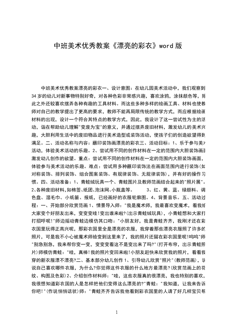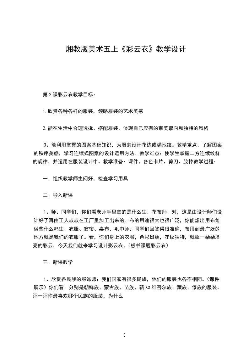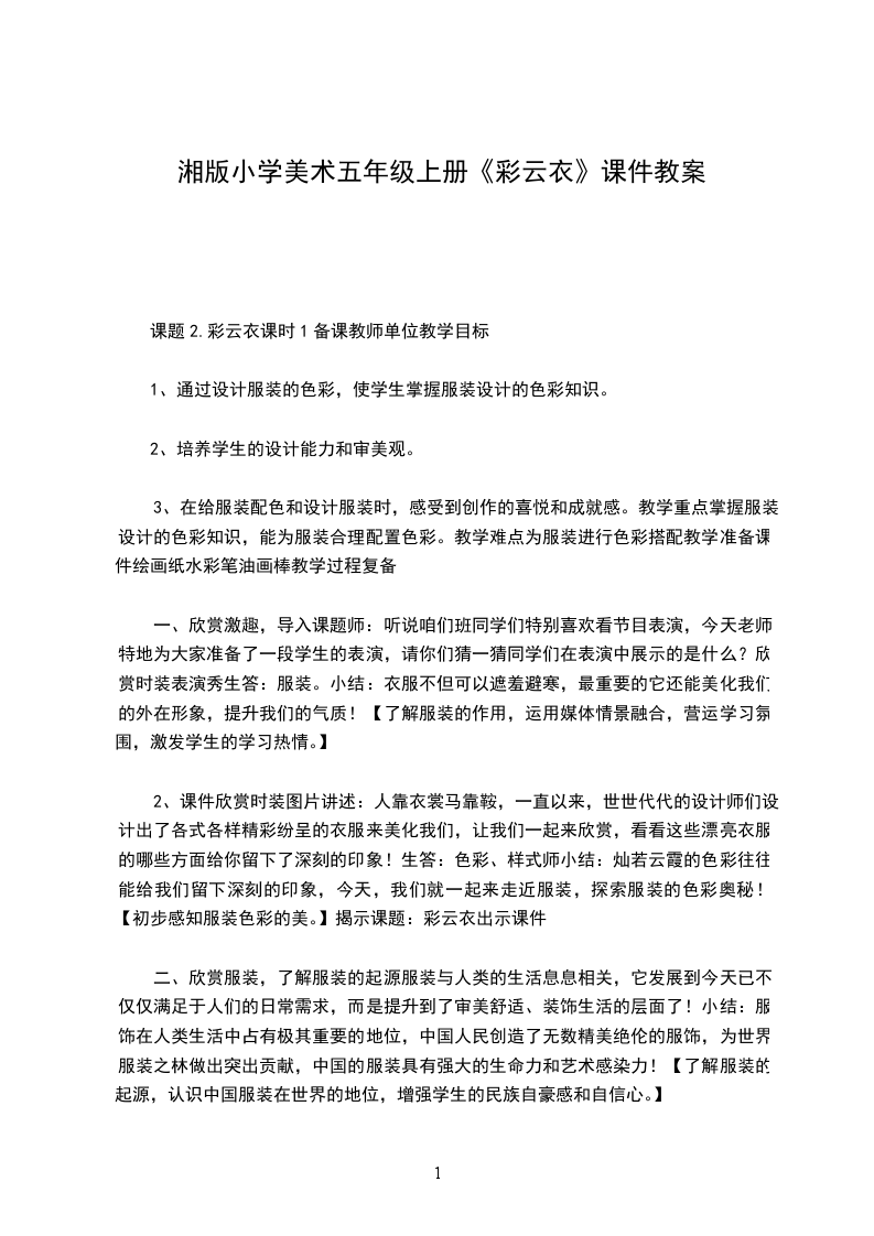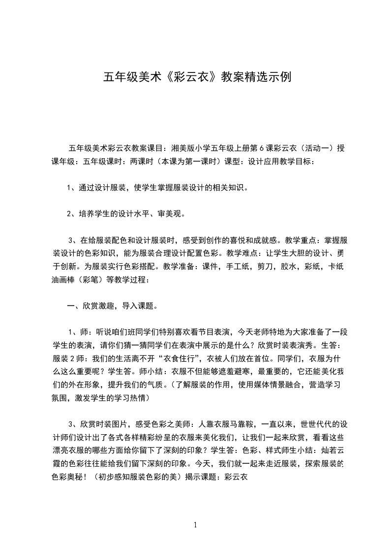 五、教学建议1收集图片、文字资料时,教师应选择有代表性的作品让学生欣赏,在考虑范例呈现顺序时,应将具有概念鲜明特征的范例最先呈现,呈现的顺序要根据学习内容和学生的实际情况而定,如图片的呈现符合国情和道德标准,不对学生产生消极影响。2高年级的学生在进行评价时,不宜只用“漂亮”这些词语来表达,教师应尽量引导学生综合本课及以往所学过的知识,用一些简单的美术术语,表达自己对优秀大师作品或同学作品的感受和理解。3小学高年级美术知识的传输,依然强调以感觉、感知为主,认知的概念,探究的规律,是潜移默化的学习过程。教师应有良好的课程观,课时目标安排合理。今天这个班的学生不一定个个成为服装设计师,但我们希望他们能怀着健康向上的审美追求,穿着美观得体的服装幸福地生活。
