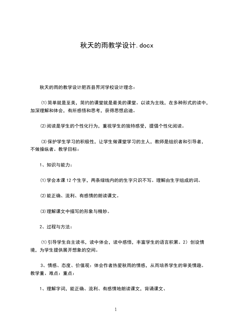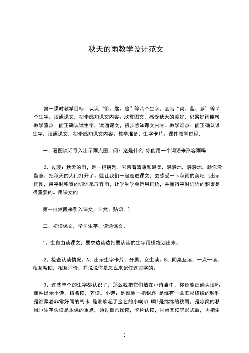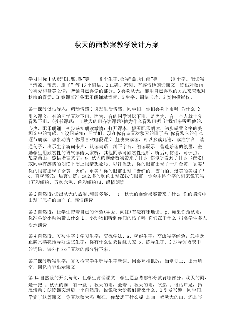 2、过渡:秋天的雨,是一把钥匙。它带着清凉和温柔,轻轻地,轻轻地,趁你没留意,把秋天的大门打开了。就让我们一起走进课文,去感受一下秋雨的美吧!(出示雨图,用平时积累的词语来形容雨,让学生学会运用词语,并懂得平时词语的积累是很重要的。用课文的