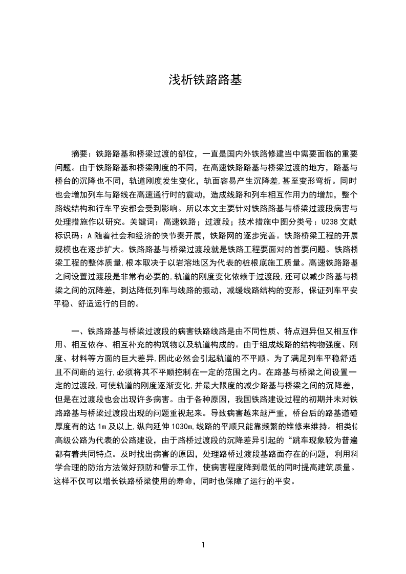 二、国内外铁路路基与桥梁过渡段的处理措施国外路桥处理措施路桥过渡的部位在国外的高速铁路修建中也是非常得到重视的。在结构的构造、工期的安排上都非常重视,施工组织和原材料质量也力求完美。为了确保路线的高平顺,对轨道刚度变化及轨面变形(不均匀沉降引起)进行严格的控制。日本的处理措施是将碎石填充在桥梁过度的建筑段;德国的处理措施是将桥梁过渡段路基的宽度适量加宽,并且将桥梁到路基方向的道碴厚度逐渐递减;法国的处理措施是设置一些过渡桥台在路基与桥梁的过渡段。我国路桥处理的情况在经过大力的关注和严格的治理,我国在路桥问题的处理上取得了一些成绩,也总结出了一些有效的方法。我国在处理铁路与桥梁过渡段问题时,主要从以下几个方面入手:第一是要减小路基结构物的沉降,减少路基与桥梁刚度差异和沉降差异,这就需要增大基床的竖向刚度,加强路基结构;第二是提高轨道竖向刚度,采取措施在路基一侧减小路桥间轨道刚度的变化率;第三是在桥梁的一侧轨道结构设置橡胶垫块以减小轨道的竖向刚度。