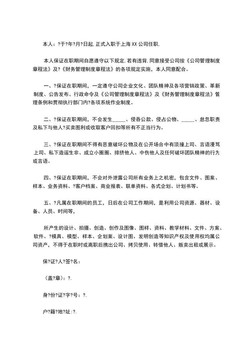一、?保证在职期间,一定遵守公司企业文化、团队精神及各项营销政策、革新制度、公告发布、行政命令及《公司管理制度章程法》及《财务管理制度章程法》管理条例和贯彻执行部门内?各项系统作业制度。