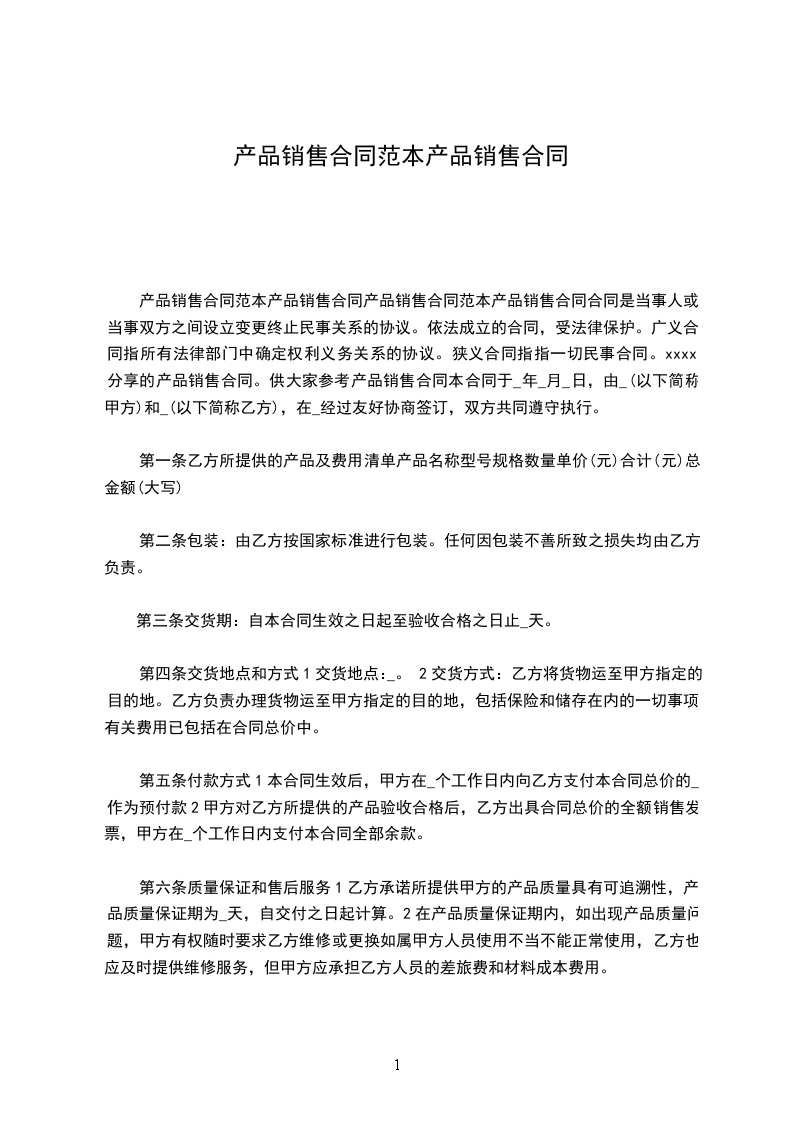 产品销售合同范本产品销售合同产品销售合同范本产品销售合同合同是当事人或当事双方之间设立变更终止民事关系的协议。依法成立的合同,受法律保护。广义合同指所有法律部门中确定权利义务关系的协议。狭义合同指指一切民事合同。xxxx分享的产品销售合同。供大家参考产品销售合同本合同于_年_月_日,由_(以下简称甲方)和_(以下简称乙方),在_经过友好协商签订,双方共同遵守执行。